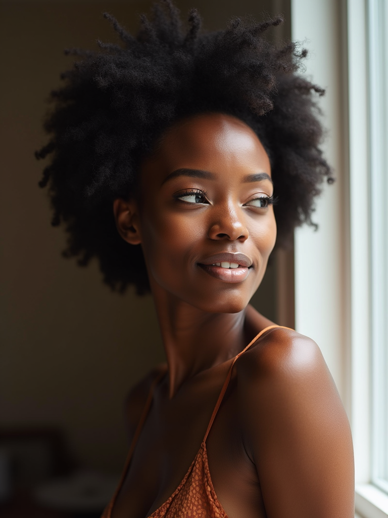 candid-style headshot of model, looking slightly off-camera, soft smile, cozy indoor setting (e.g., near a window), relaxed posture