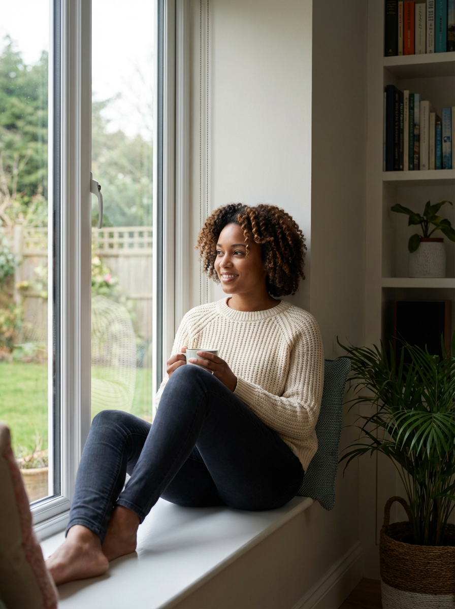candid-style headshot of model, looking slightly off-camera, soft smile, cozy indoor setting (e.g., near a window), relaxed posture