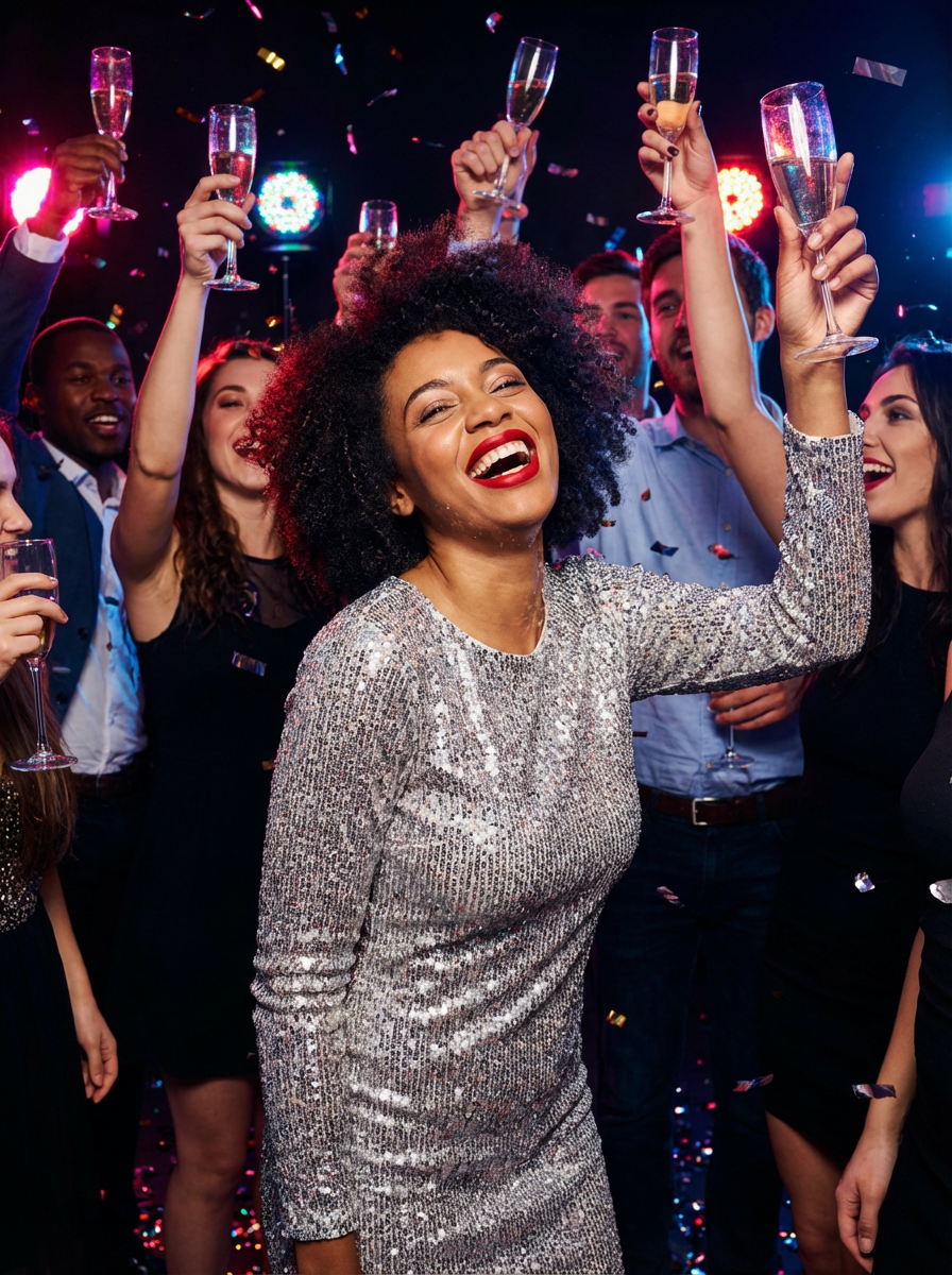 Candid view of model laughing joyfully, dressed as a glamorous diva in a sparkling silver dress with bold makeup . Set in a vibrant party scene, surrounded by people cheering and raising champagne glasses. Dynamic lighting.