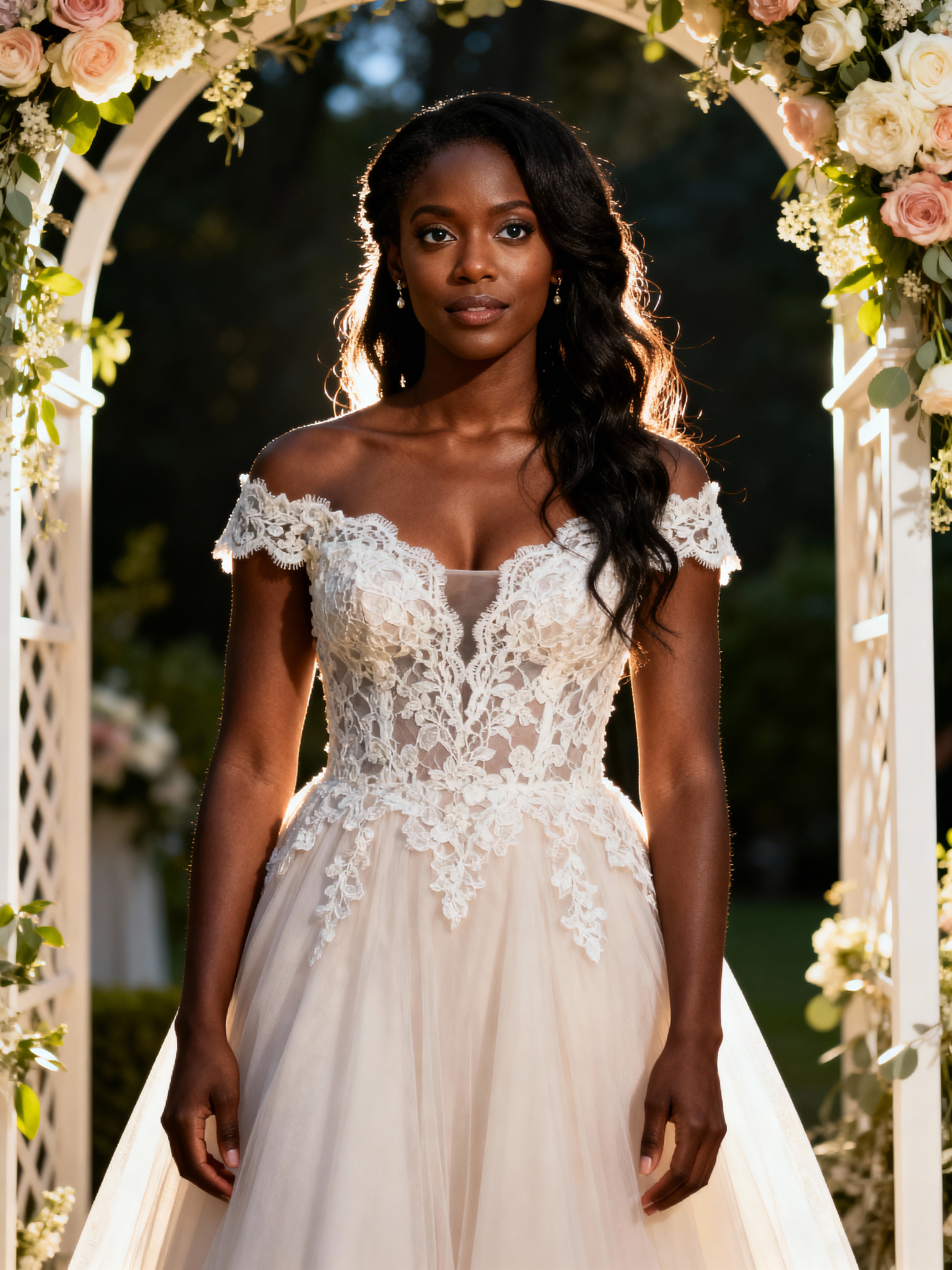 Candid wedding moment, standing by a floral wedding arch. Model wearing a lace-trimmed gown . Natural soft-focus background, elegant setting.