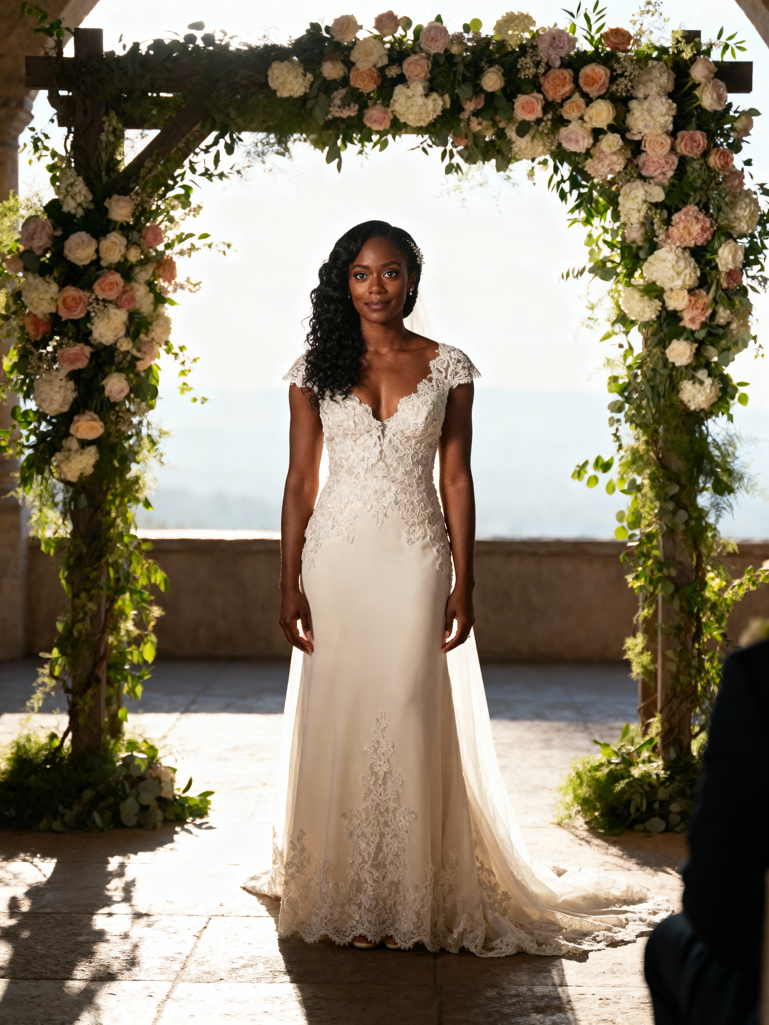 Candid wedding moment, standing by a floral wedding arch. Model wearing a lace-trimmed gown . Natural soft-focus background, elegant setting.