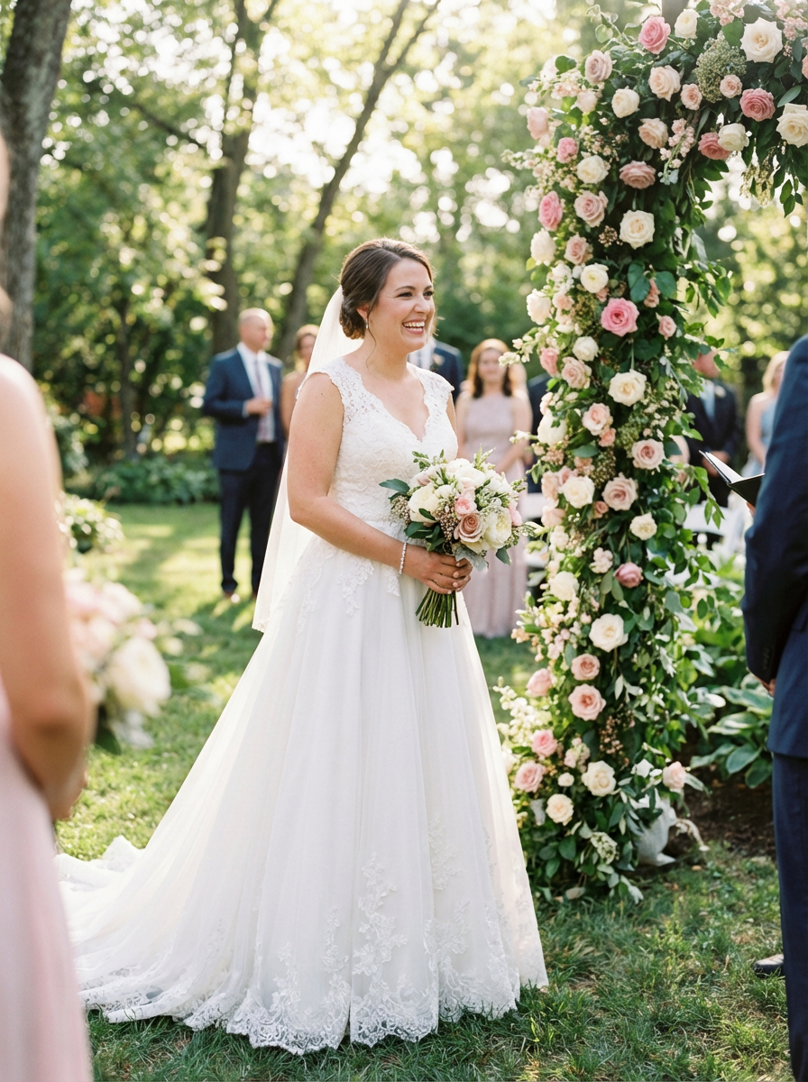 Candid wedding moment, standing by a floral wedding arch. Model wearing a lace-trimmed gown . Natural soft-focus background, elegant setting.