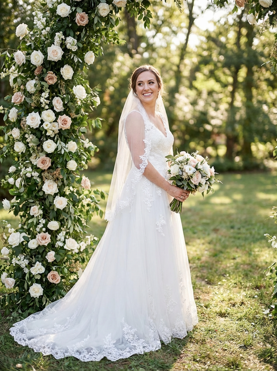 Candid wedding moment, standing by a floral wedding arch. Model wearing a lace-trimmed gown . Natural soft-focus background, elegant setting.