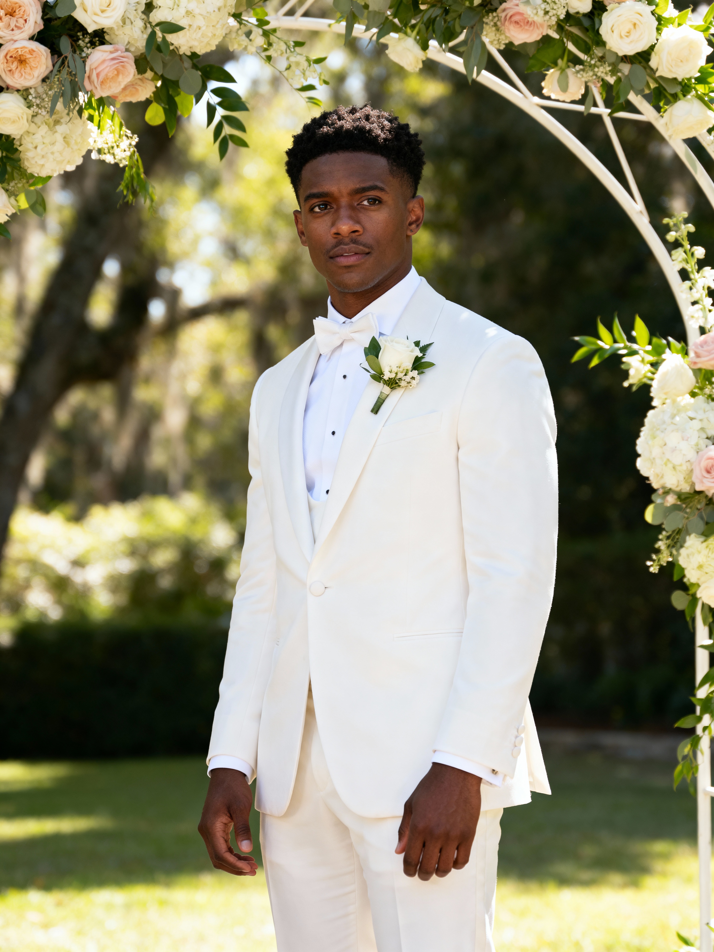 Candid wedding moment, standing by a floral wedding arch. Model wearing a tailored white suit with boutonnière . Natural soft-focus background, elegant setting.