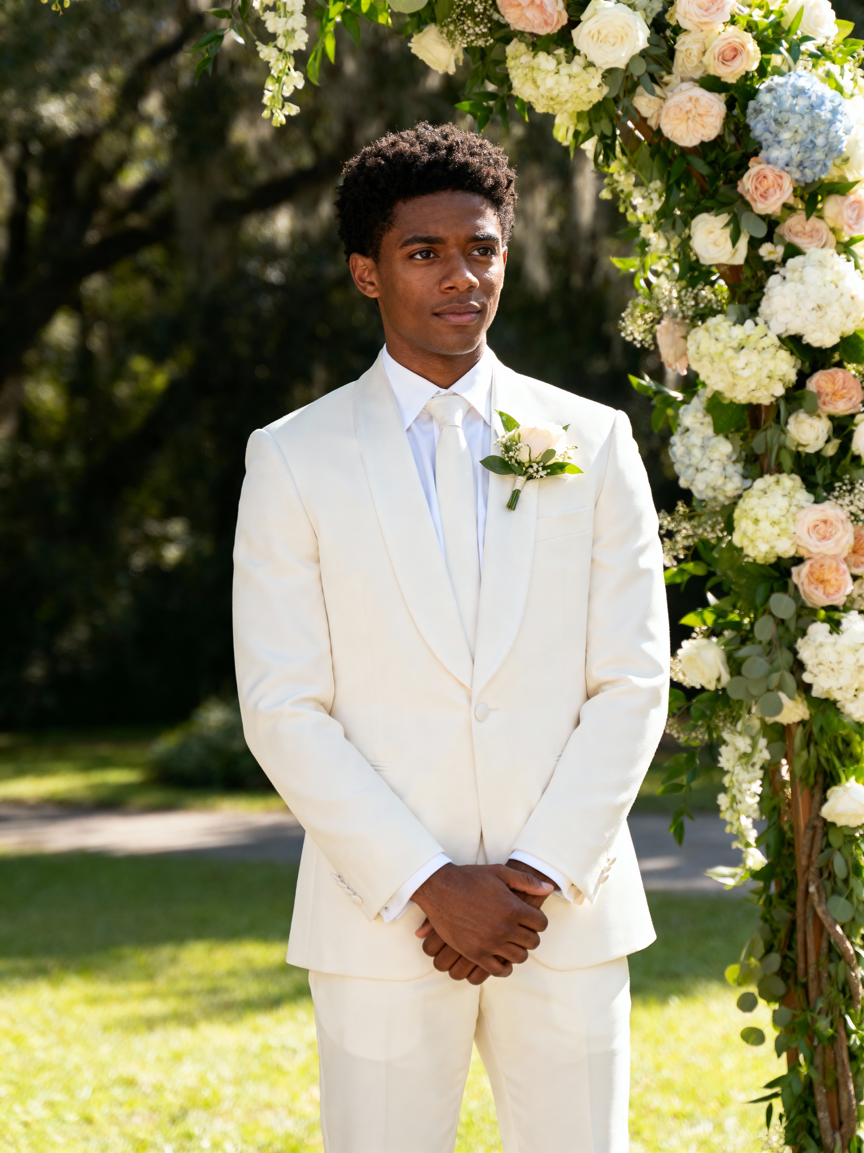 Candid wedding moment, standing by a floral wedding arch. Model wearing a tailored white suit with boutonnière . Natural soft-focus background, elegant setting.