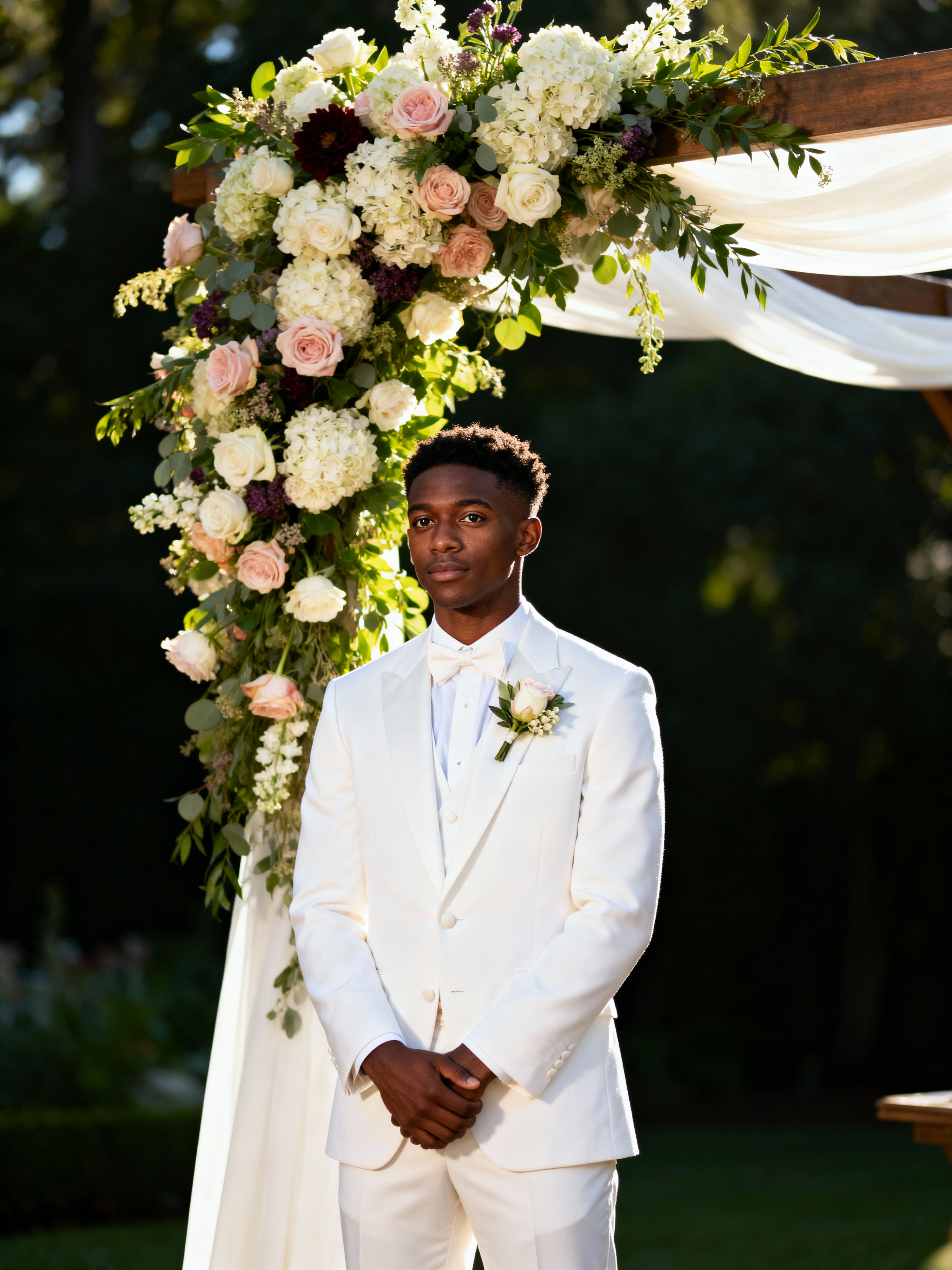 Candid wedding moment, standing by a floral wedding arch. Model wearing a tailored white suit with boutonnière . Natural soft-focus background, elegant setting.