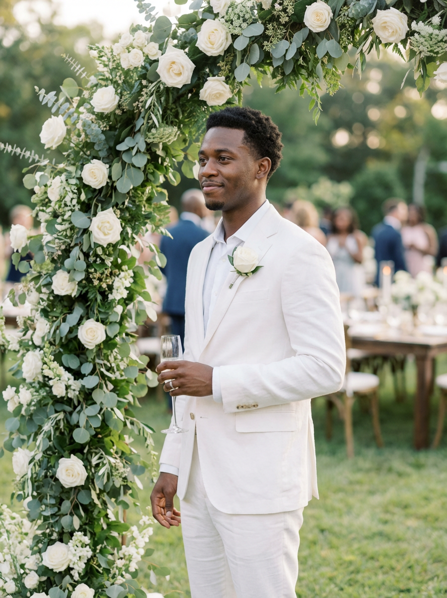 Candid wedding moment, standing by a floral wedding arch. Model wearing a tailored white suit with boutonnière . Natural soft-focus background, elegant setting.