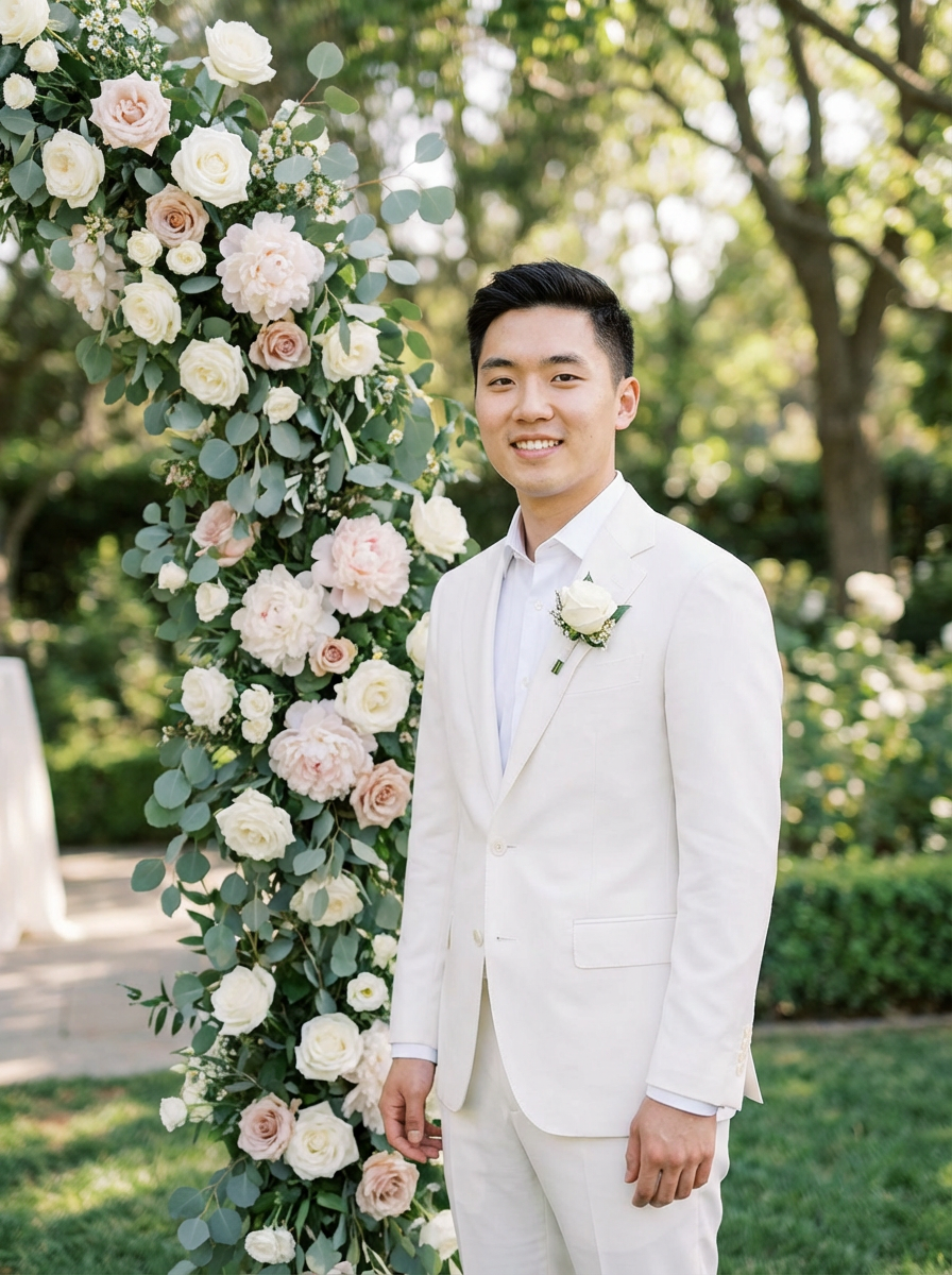 Candid wedding moment, standing by a floral wedding arch. Model wearing a tailored white suit with boutonnière . Natural soft-focus background, elegant setting.