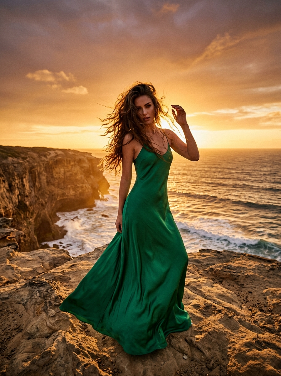 Captivating model with cascading hair blowing wildly in ocean wind, wearing flowy silk slip dress, standing on cliffside at sunset, dramatic golden light, intense gaze, full-body dynamic pose, high-fashion campaign, wide-angle lens, epic glamorous mood.