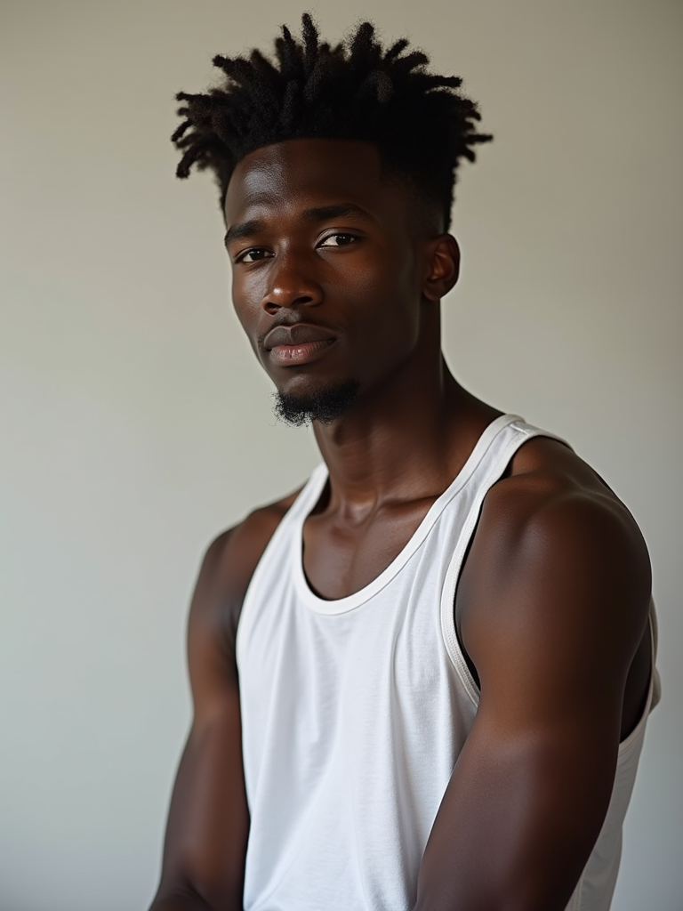 casual profile headshot photo of model for instagram. hasselblad photography. white tanktop.