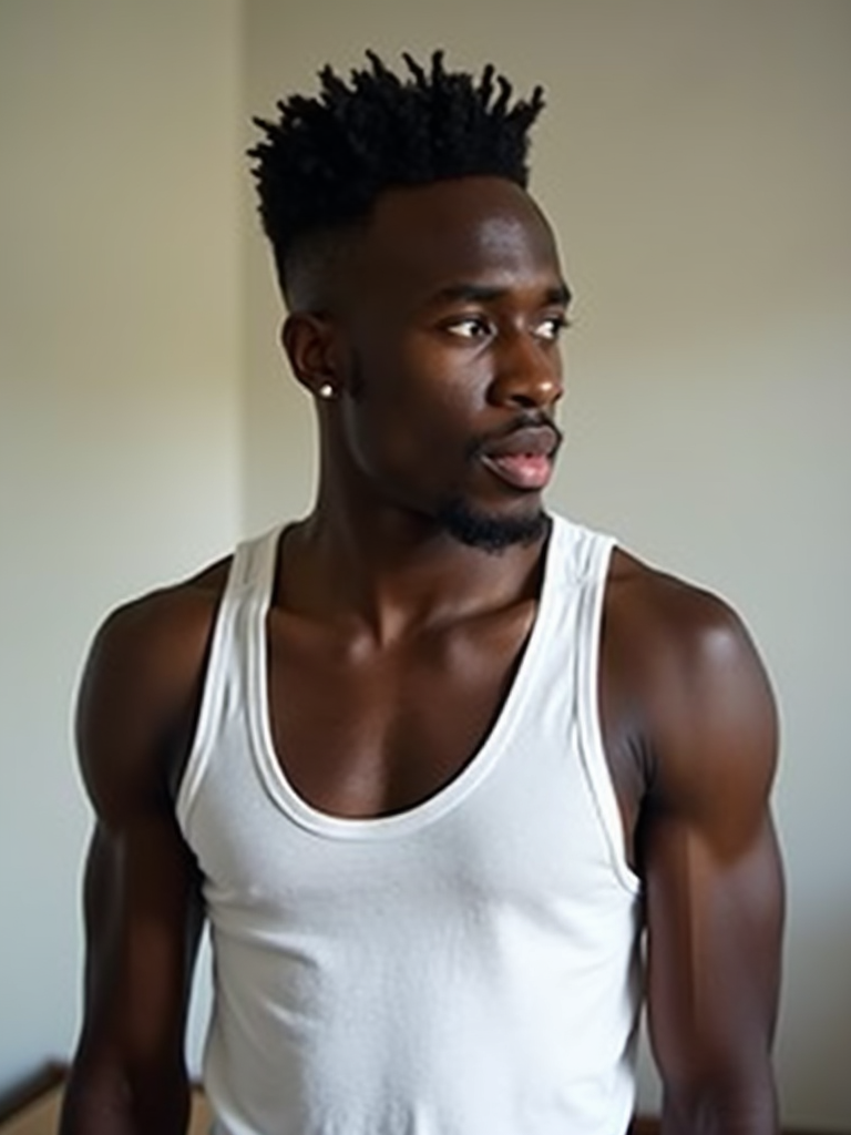 casual profile headshot photo of model for instagram. hasselblad photography. white tanktop.