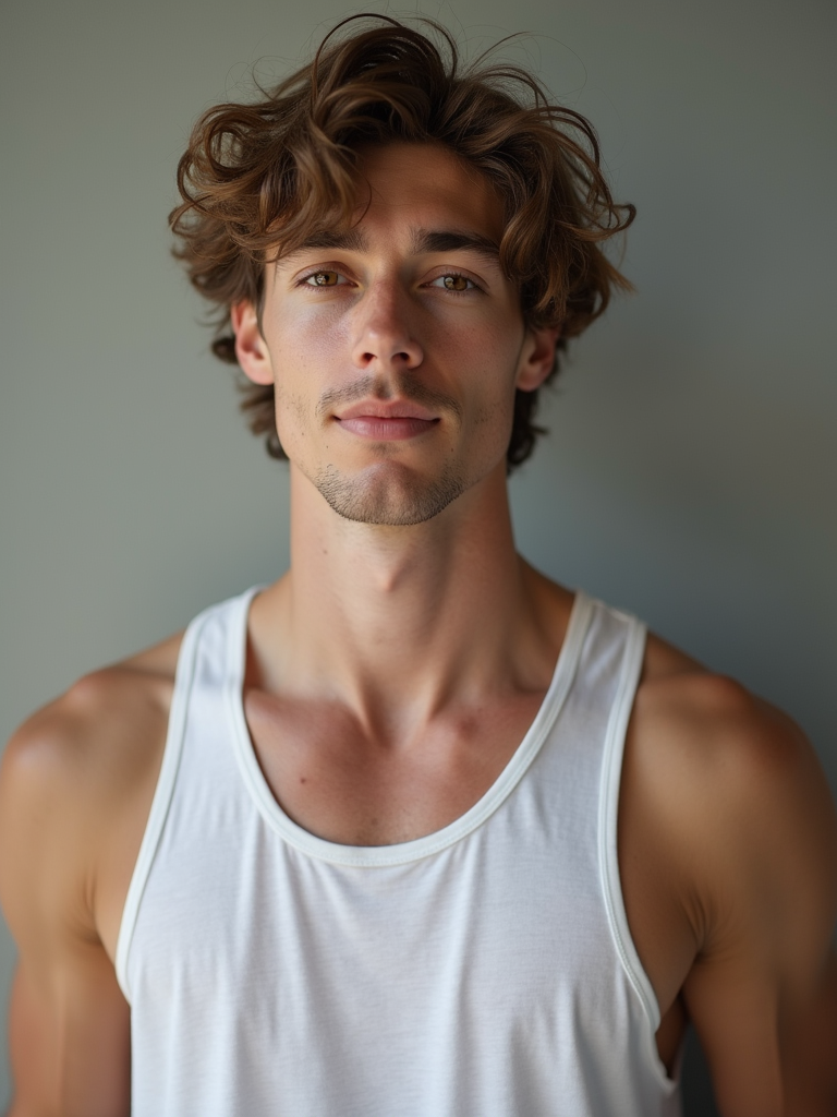 casual profile headshot photo of model for instagram. hasselblad photography. white tanktop.