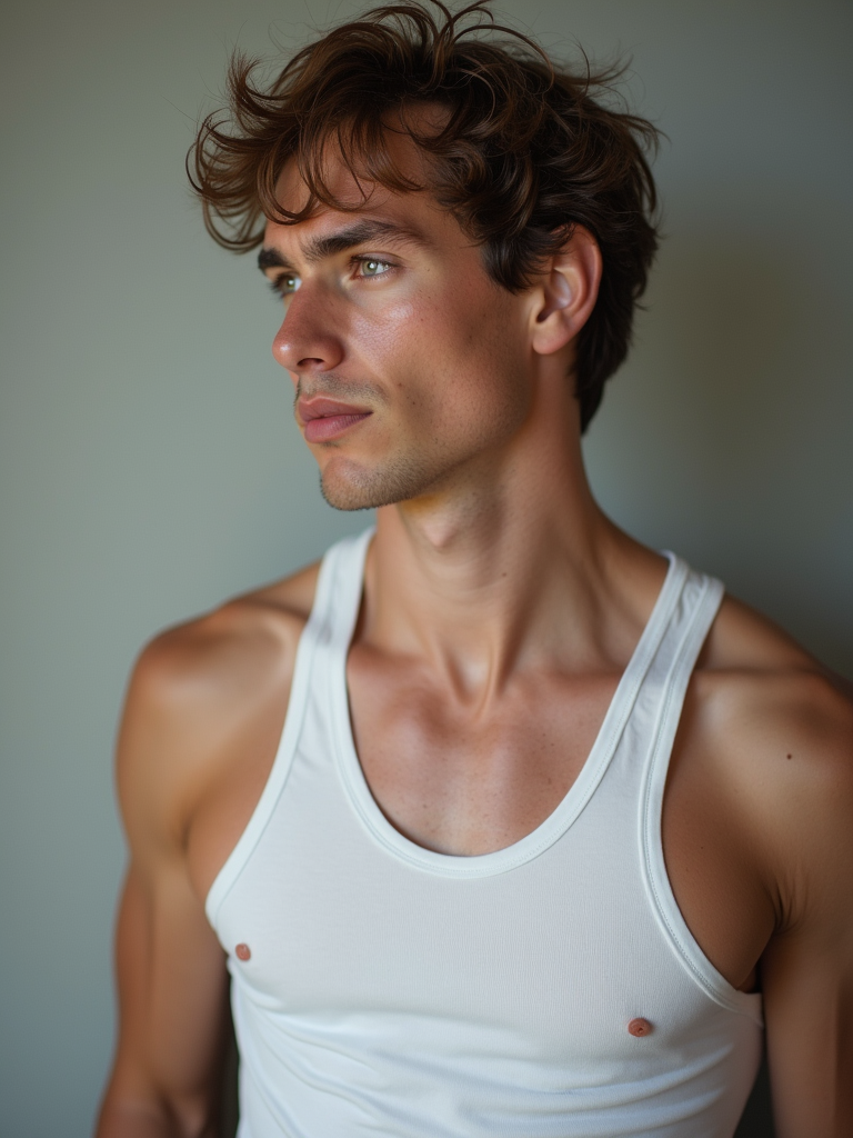 casual profile headshot photo of model for instagram. hasselblad photography. white tanktop.