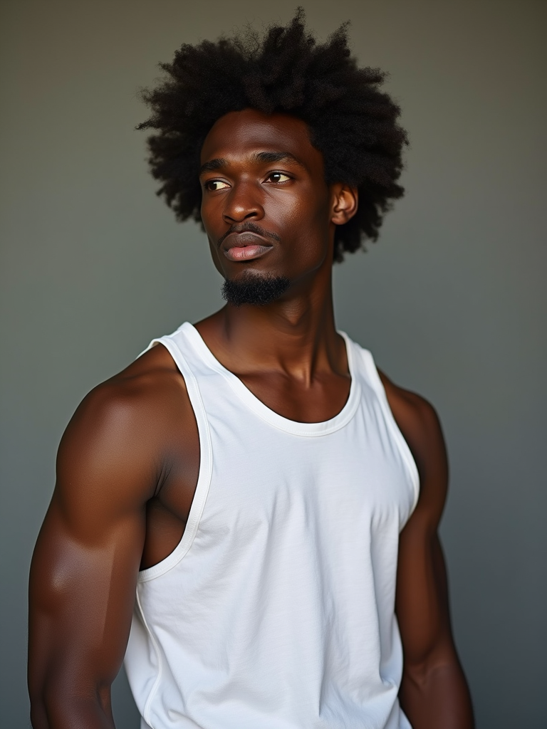 casual profile headshot photo of model for instagram. hasselblad photography. white tanktop.