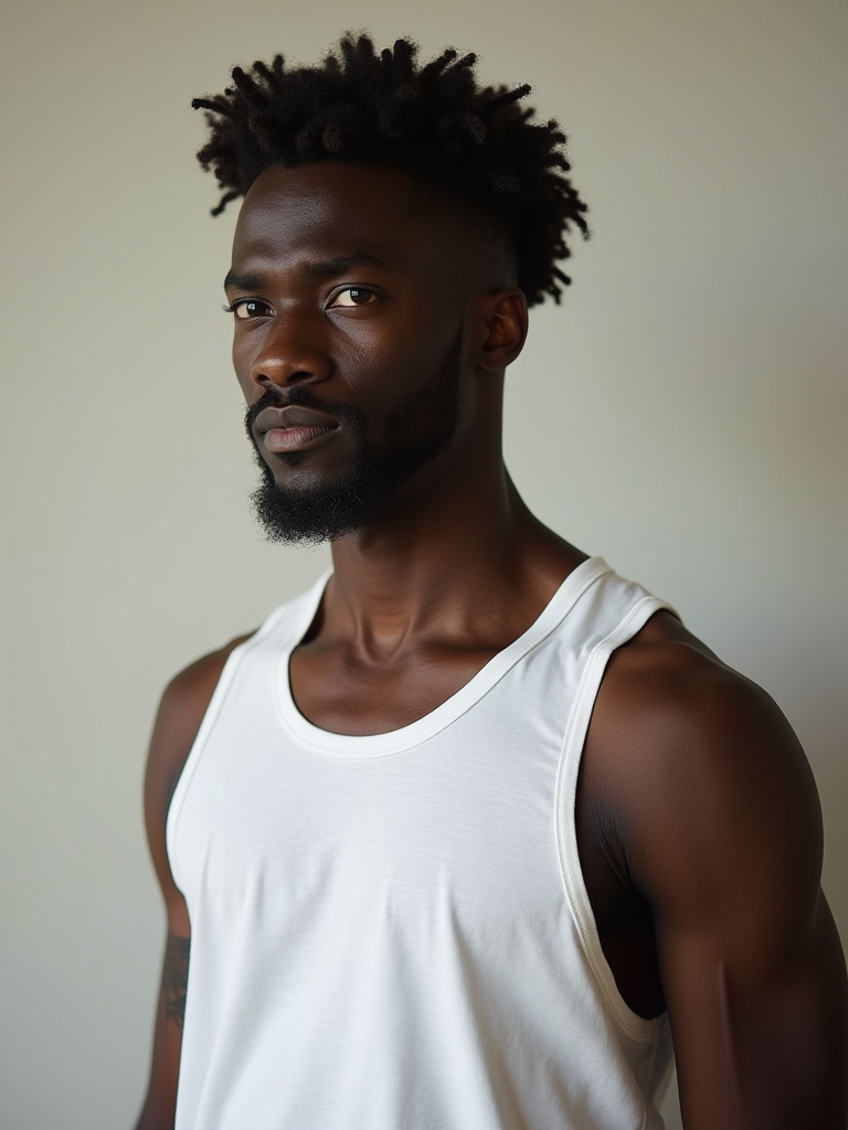 casual profile headshot photo of model for instagram. hasselblad photography. white tanktop.