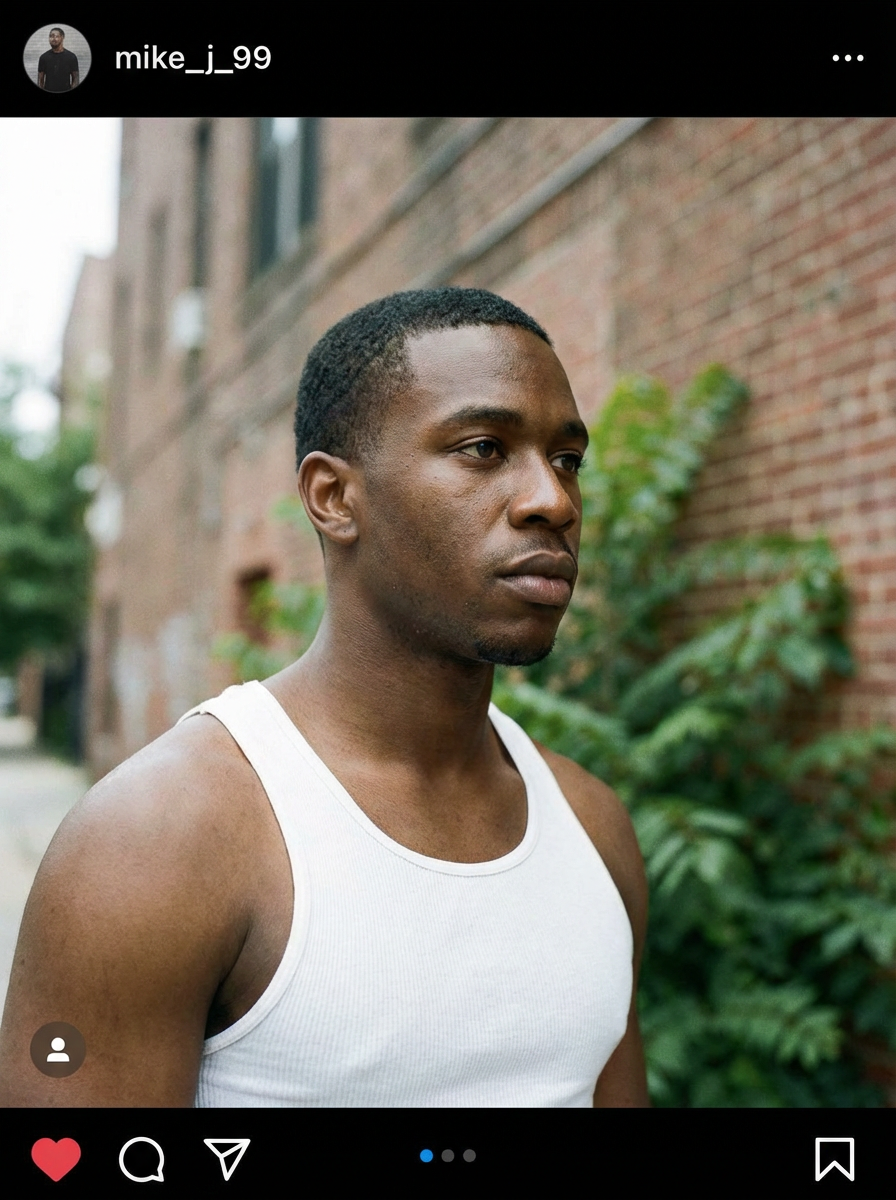 casual profile headshot photo of model for instagram. hasselblad photography. white tanktop.