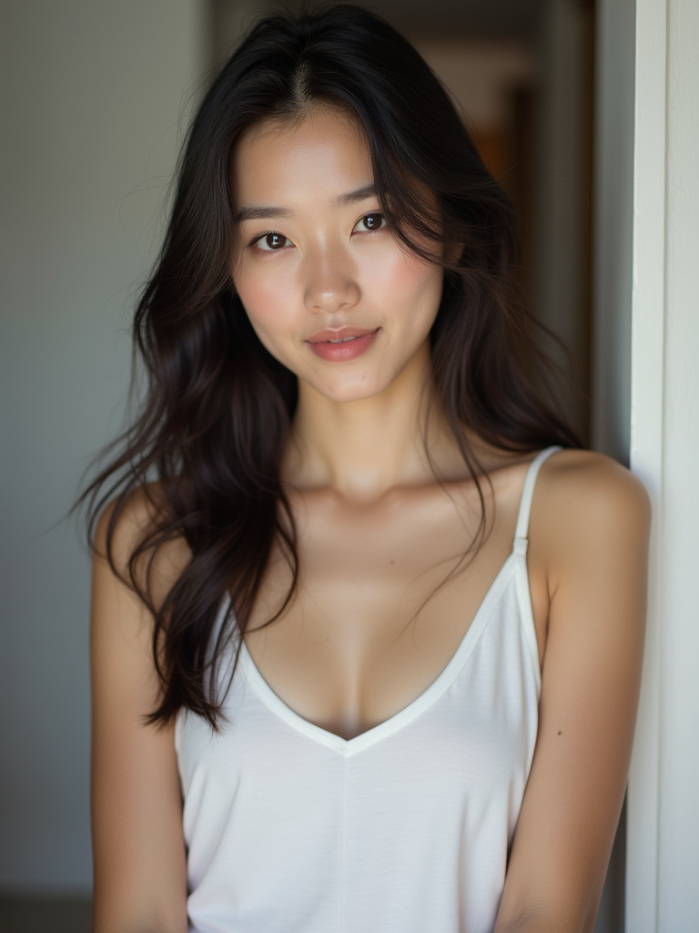 casual profile headshot photo of model for instagram. hasselblad photography. white tanktop.