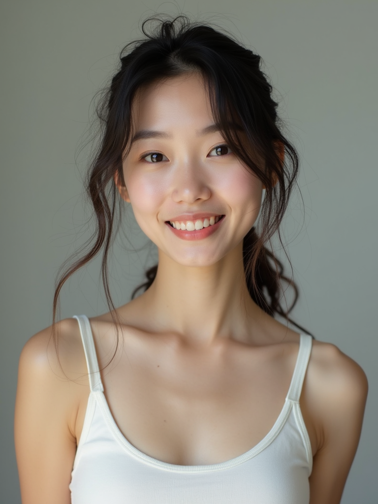 casual profile headshot photo of model for instagram. hasselblad photography. white tanktop.