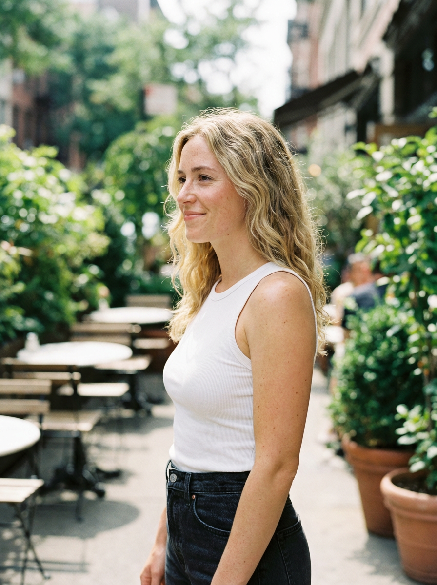 casual profile headshot photo of model for instagram. hasselblad photography. white tanktop.