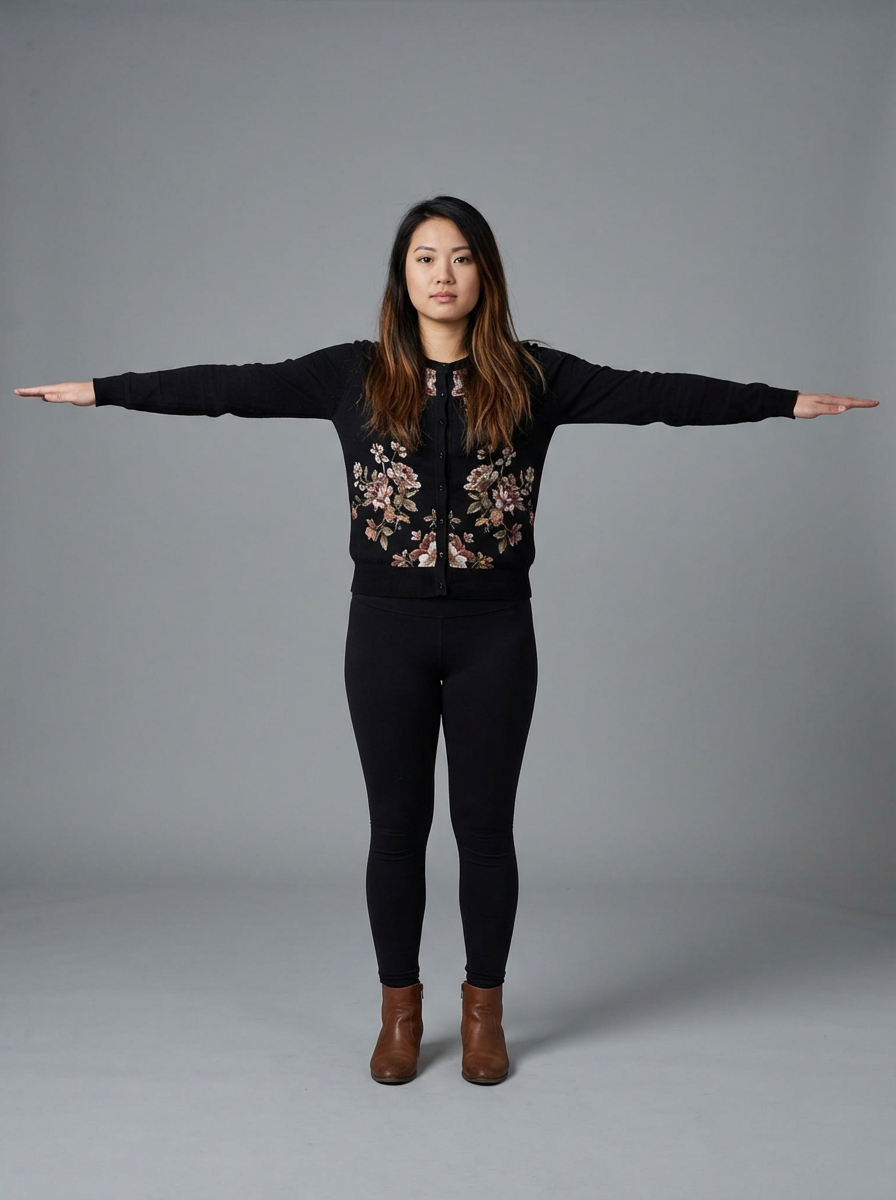 character in T-pose position, arms extended horizontally, front view, full body visible, standing straight, neutral expression, wearing cardigan, leggings, ankle boots , perfect for 3D womaning reference
