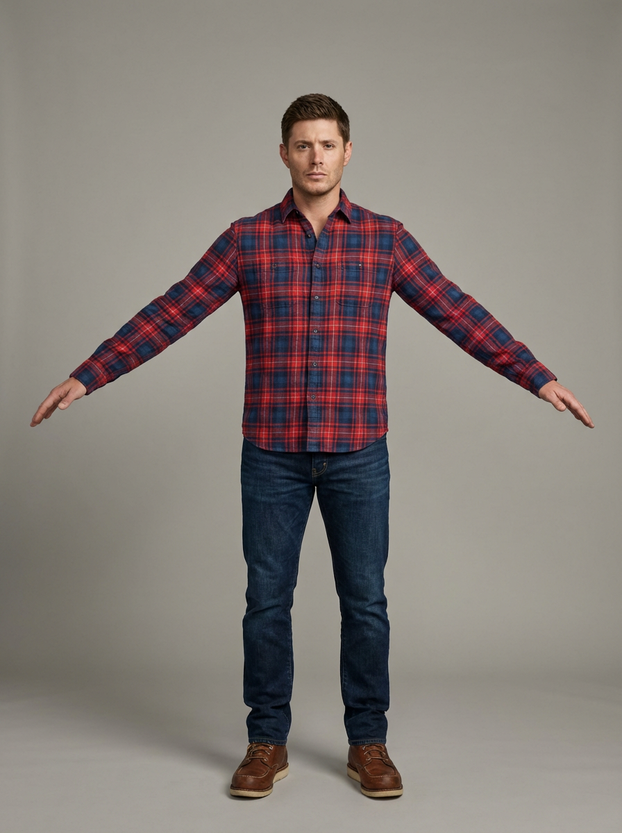character in T-pose position, arms extended horizontally, front view, full body visible, standing straight, neutral expression, wearing flannel shirt, dark jeans, work boots, perfect for 3D maning reference