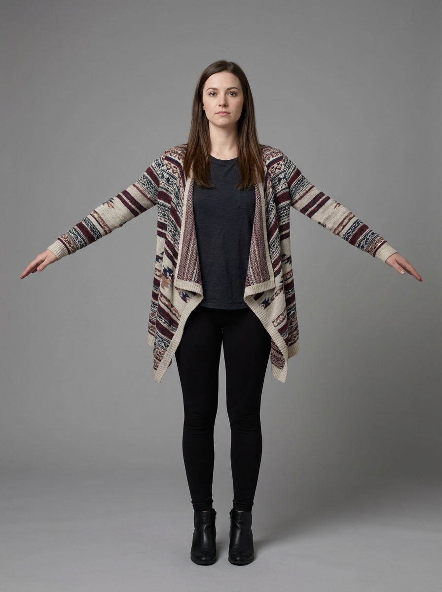 character in T-pose position, arms extended horizontally, front view, full body visible, standing straight, neutral expression, wearing cardigan, leggings, ankle boots , perfect for 3D womaning reference