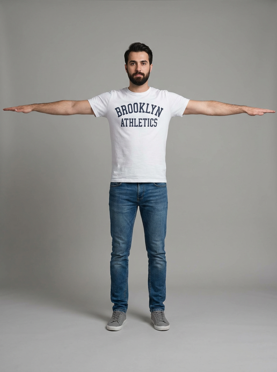 character in T-pose position, arms extended horizontally, front view, full body visible, standing straight, neutral expression, wearing casual t-shirt, jeans, sneakers , perfect for 3D womaning reference