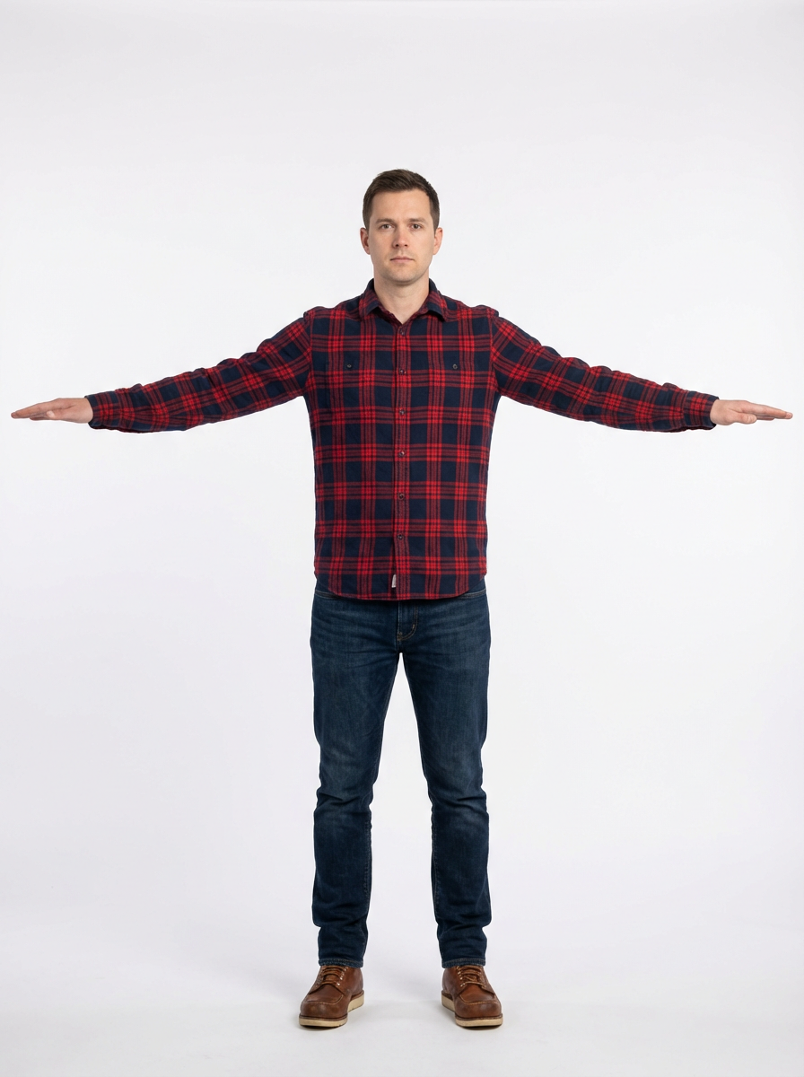 character in T-pose position, arms extended horizontally, front view, full body visible, standing straight, neutral expression, wearing flannel shirt, dark jeans, work boots, perfect for 3D maning reference