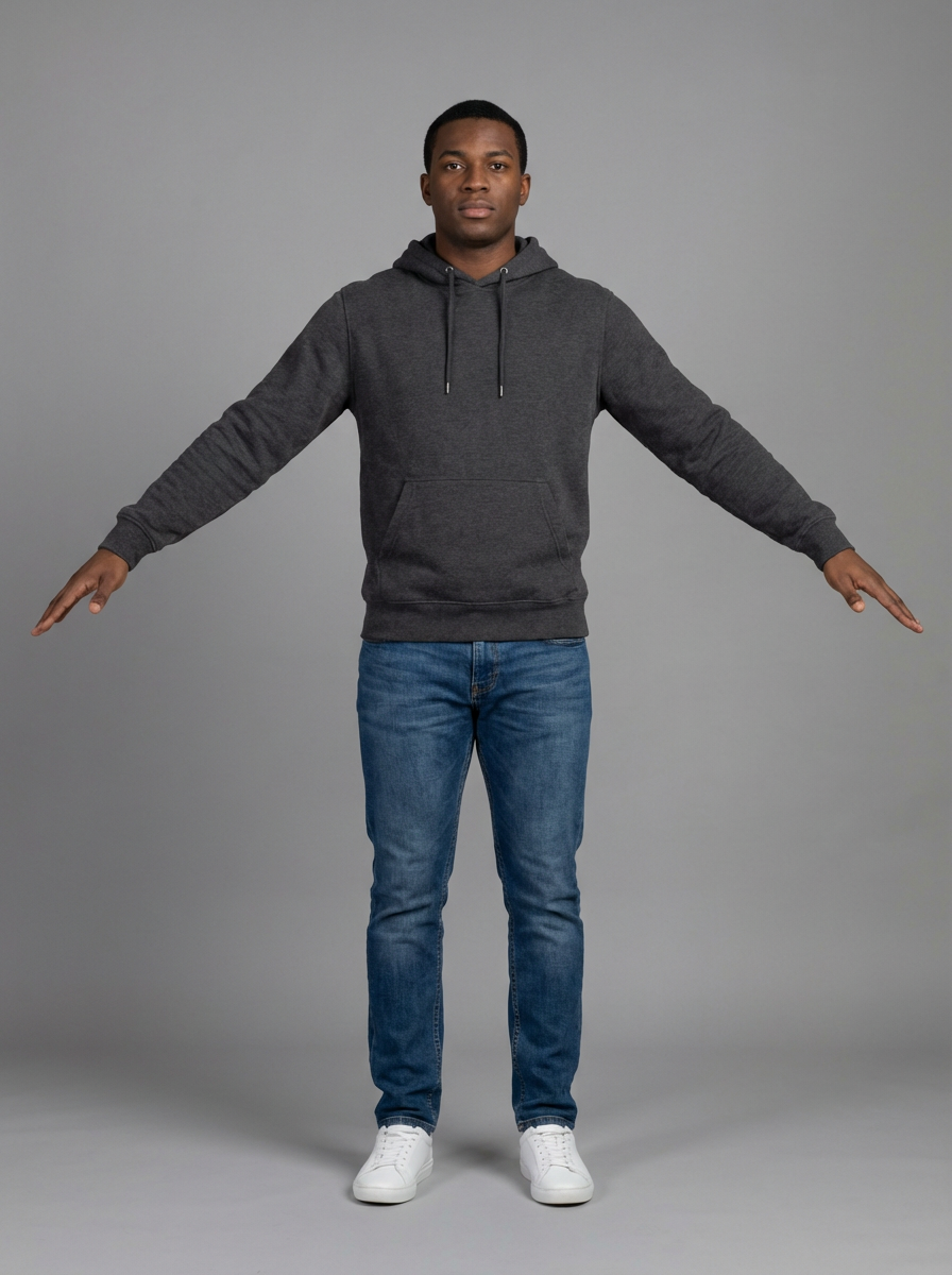character model in classic T-pose, front-facing view, arms horizontal, legs straight, wearing hoodie, jeans, sneakers, suitable for 3D mesh creation and Mixamo animation rigging