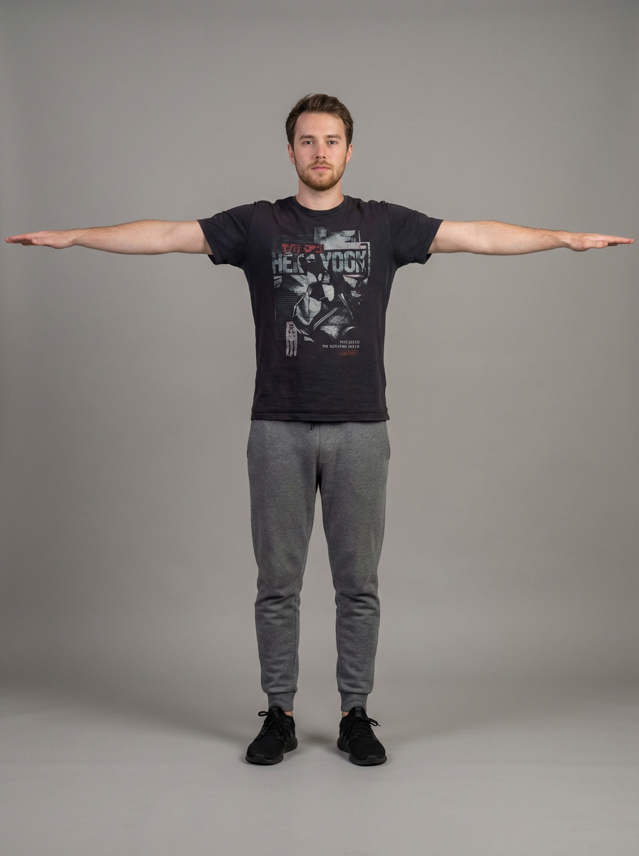 character model in classic T-pose, front-facing view, arms horizontal, legs straight, wearing graphic tee, joggers, athletic shoes, suitable for 3D mesh creation and Mixamo animation rigging