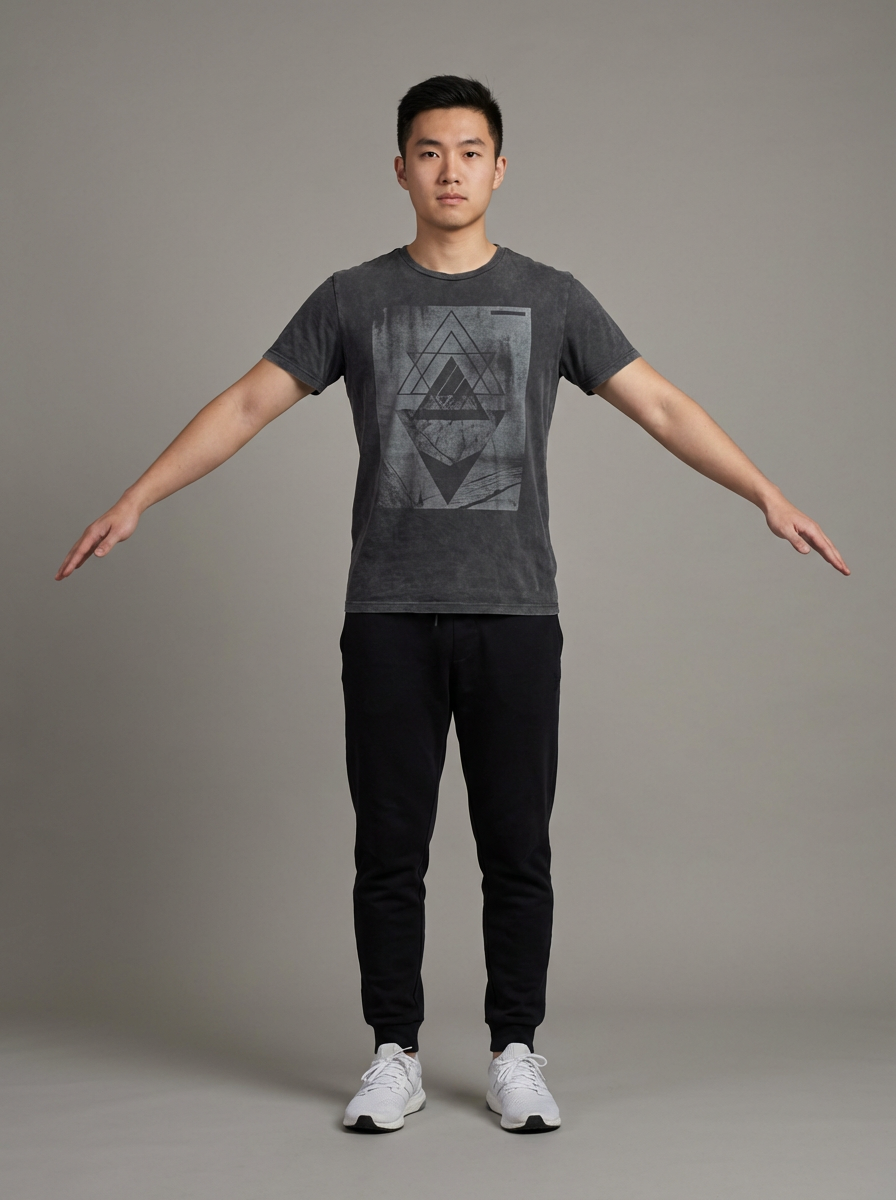 character model in classic T-pose, front-facing view, arms horizontal, legs straight, wearing graphic tee, joggers, athletic shoes, suitable for 3D mesh creation and Mixamo animation rigging