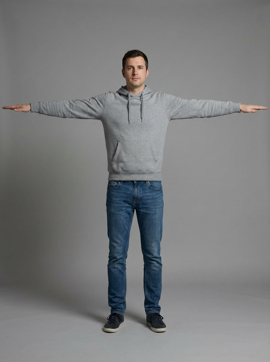 character model in classic T-pose, front-facing view, arms horizontal, legs straight, wearing hoodie, jeans, sneakers, suitable for 3D mesh creation and Mixamo animation rigging
