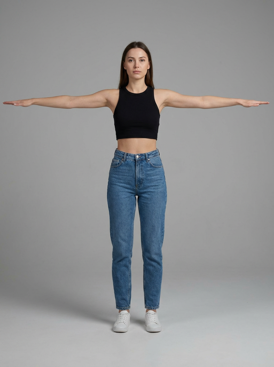 character model in classic T-pose, front-facing view, arms horizontal, legs straight, wearing crop top, high-waisted jeans, white sneakers , suitable for 3D mesh creation and Mixamo animation rigging