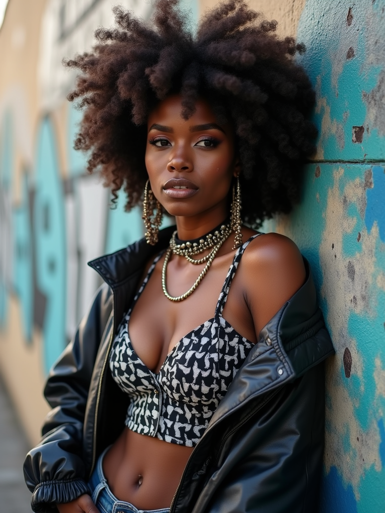 charismatic feminine model showing off an edgy streetwear look against an urban wall