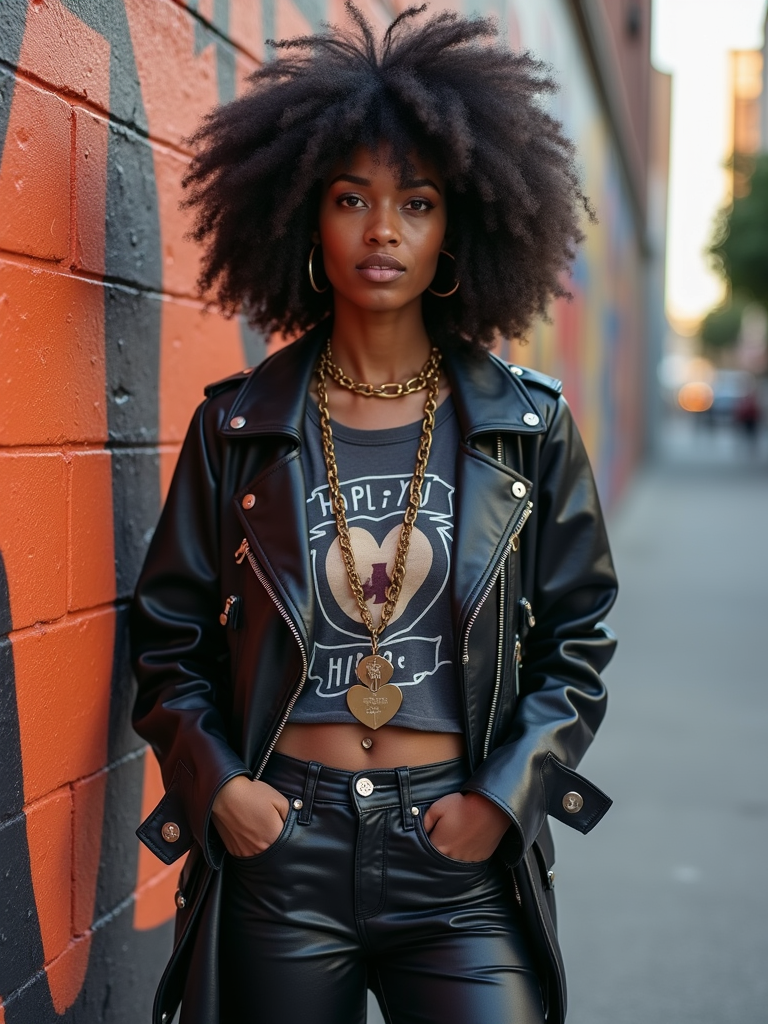 charismatic feminine model showing off an edgy streetwear look against an urban wall