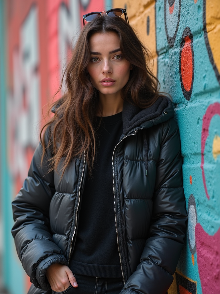charismatic feminine model showing off an edgy streetwear look against an urban wall
