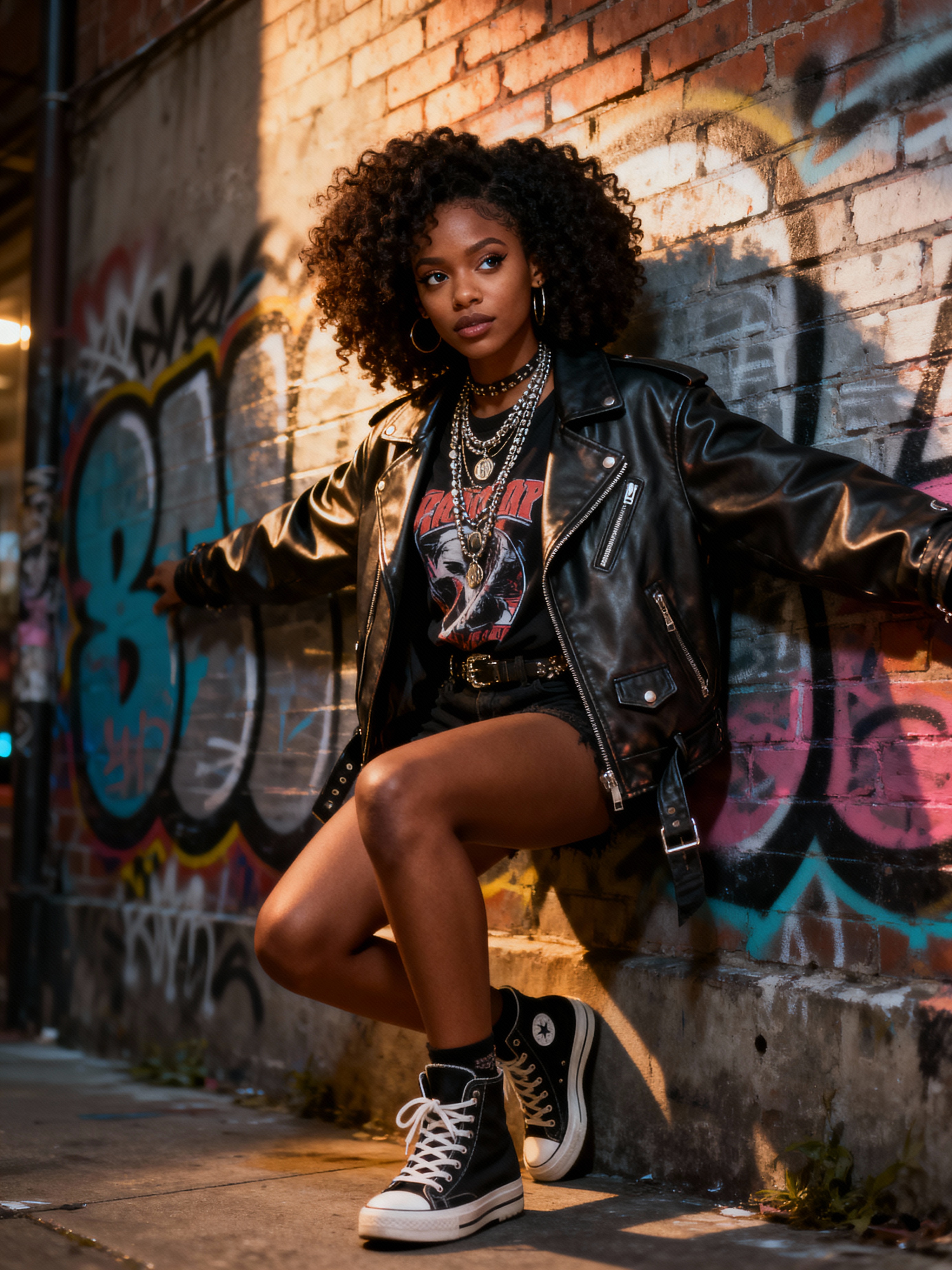 charismatic feminine model showing off an edgy streetwear look against an urban wall