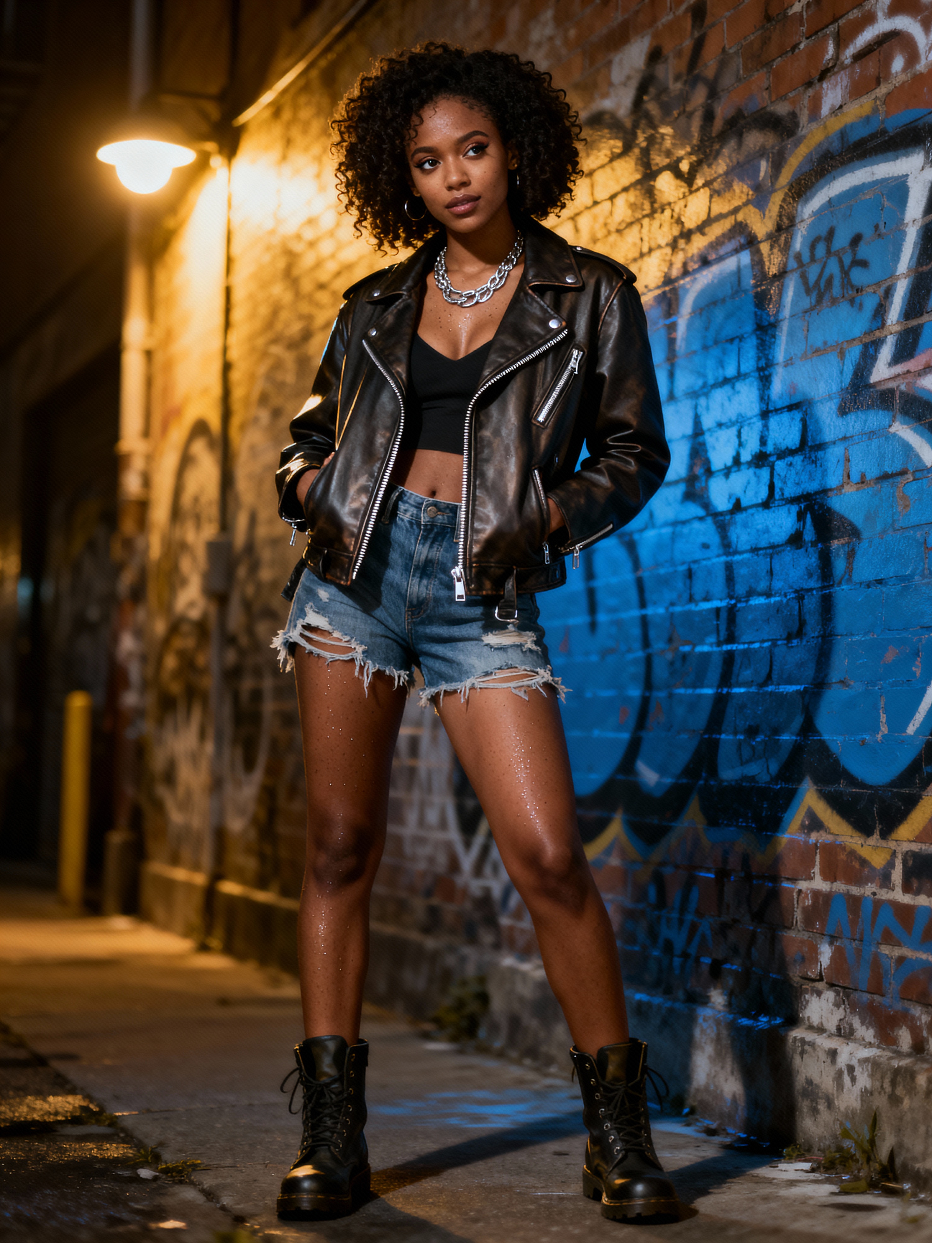 charismatic feminine model showing off an edgy streetwear look against an urban wall