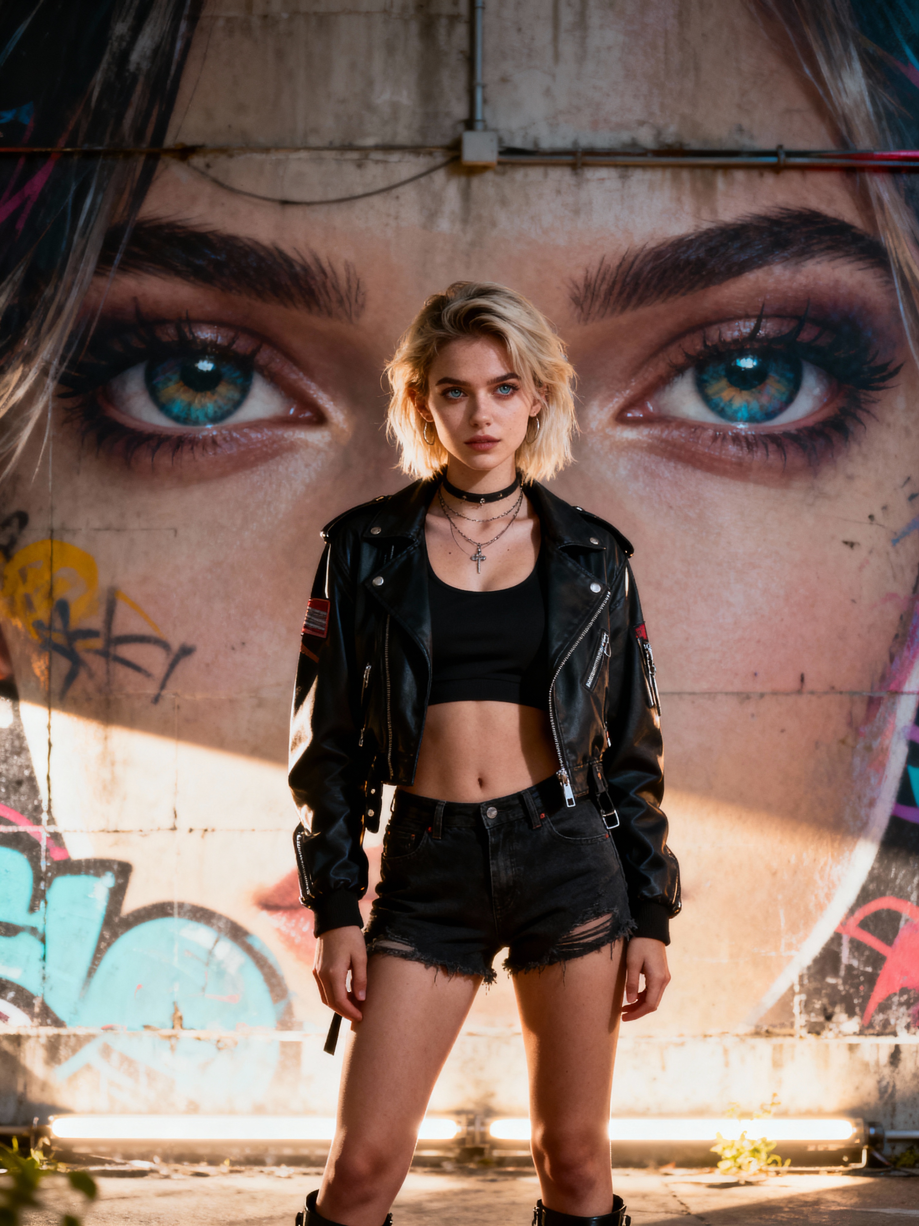charismatic feminine model showing off an edgy streetwear look against an urban wall