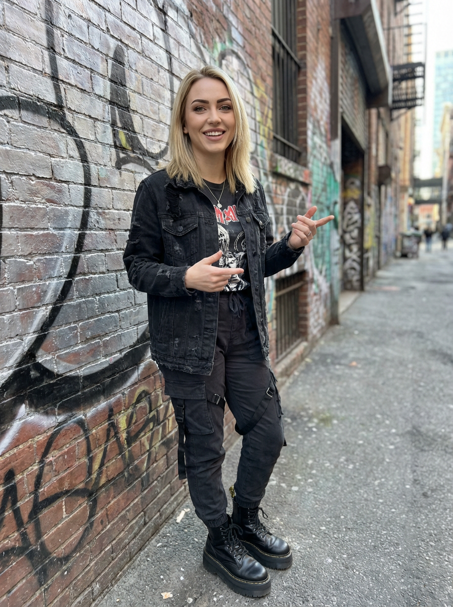 charismatic feminine model showing off an edgy streetwear look against an urban wall