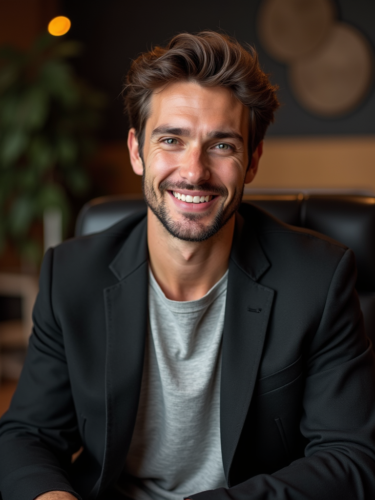 charismatic model dressed in casual blazer over quality t-shirt being interviewed, podcast studio setting, relaxed professional look
