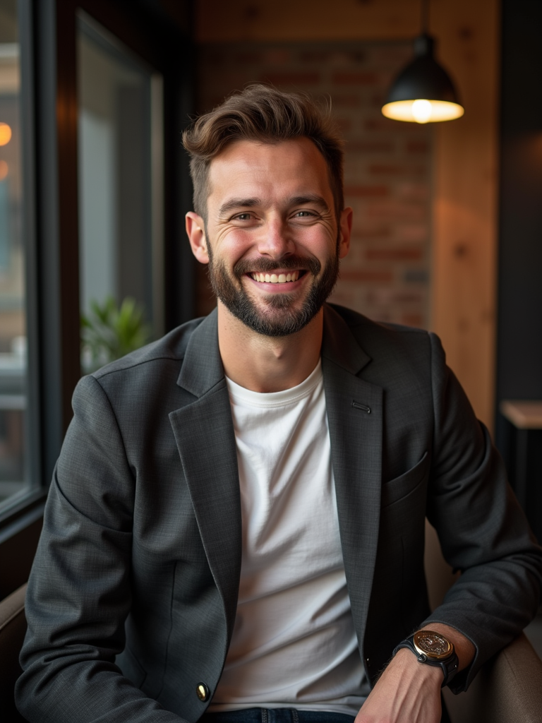 charismatic model dressed in casual blazer over quality t-shirt being interviewed, podcast studio setting, relaxed professional look