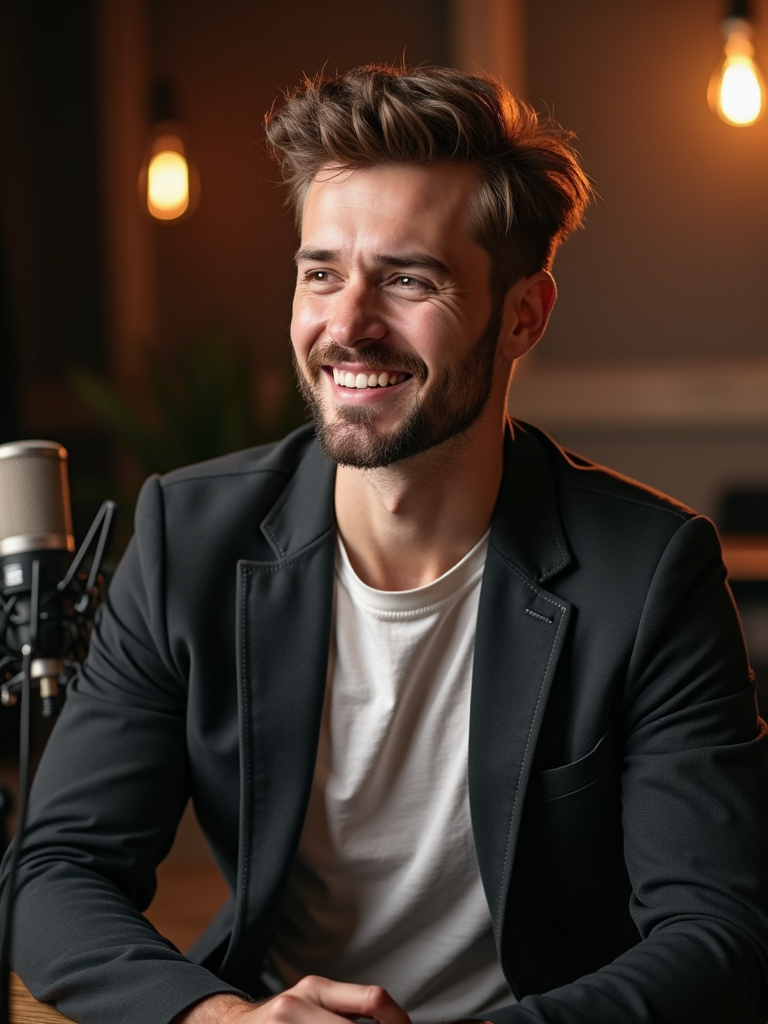 charismatic model dressed in casual blazer over quality t-shirt being interviewed, podcast studio setting, relaxed professional look