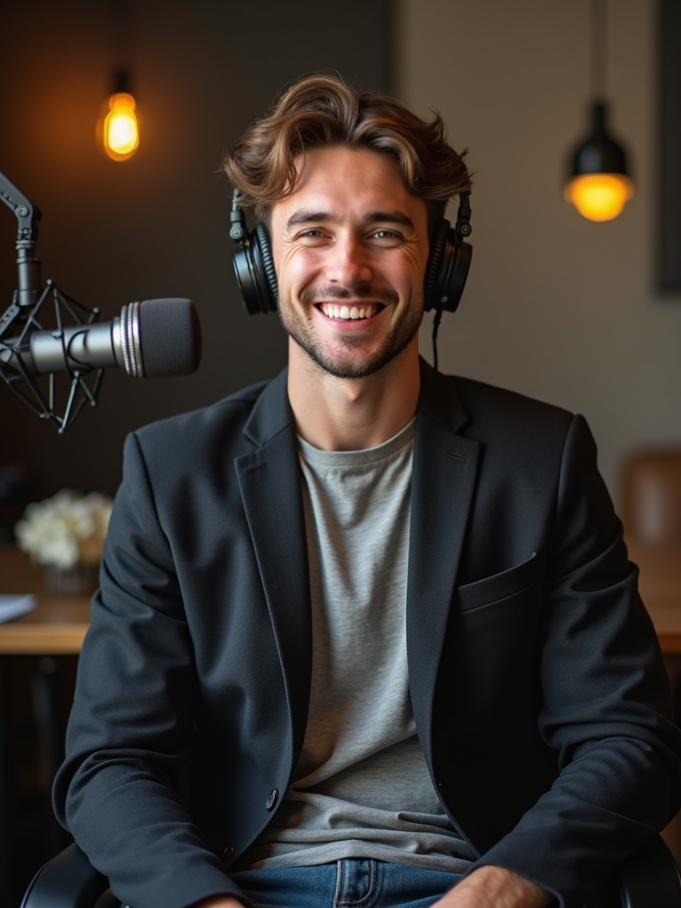 charismatic model dressed in casual blazer over quality t-shirt being interviewed, podcast studio setting, relaxed professional look