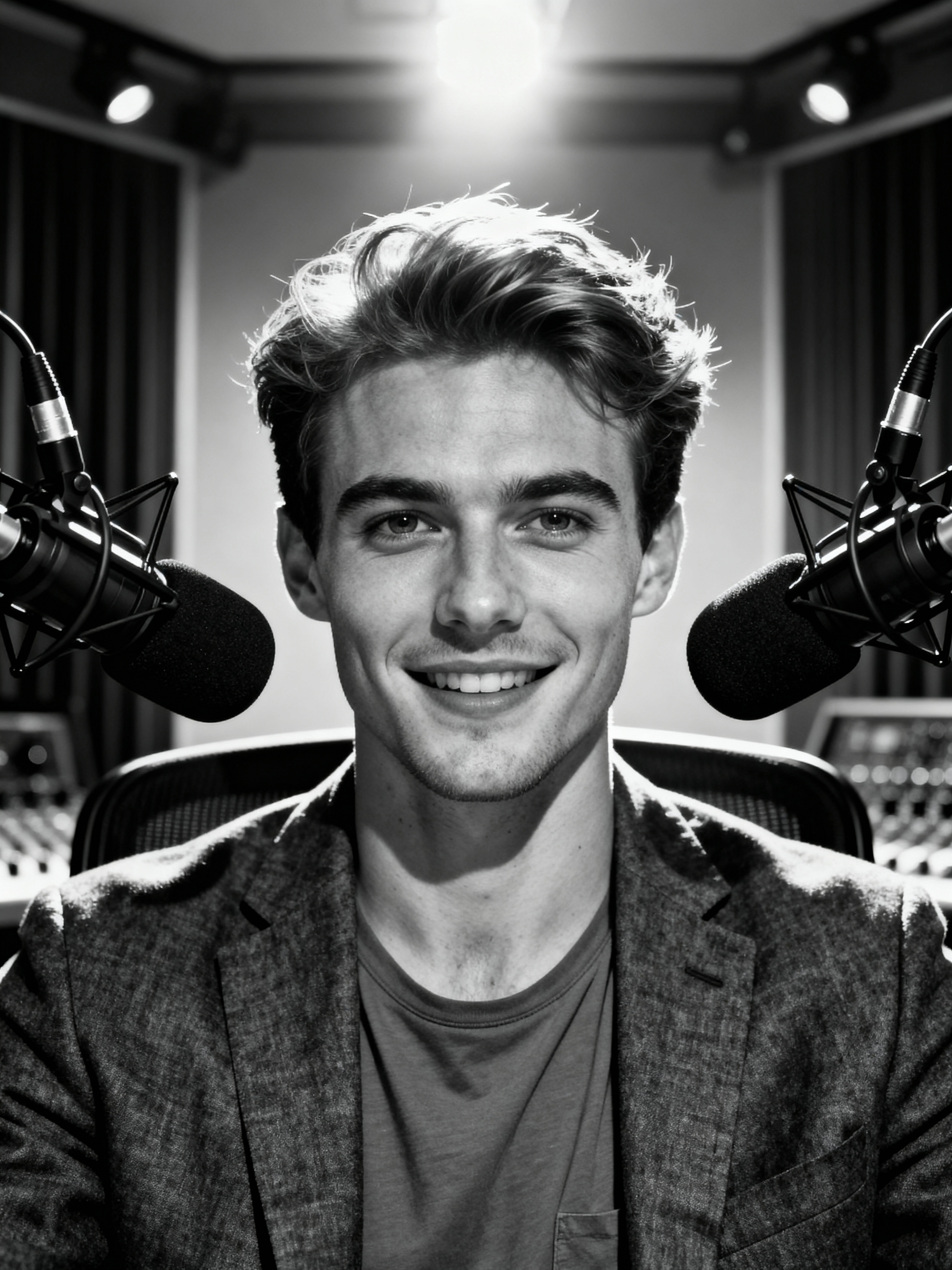 charismatic model dressed in casual blazer over quality t-shirt being interviewed, podcast studio setting, relaxed professional look