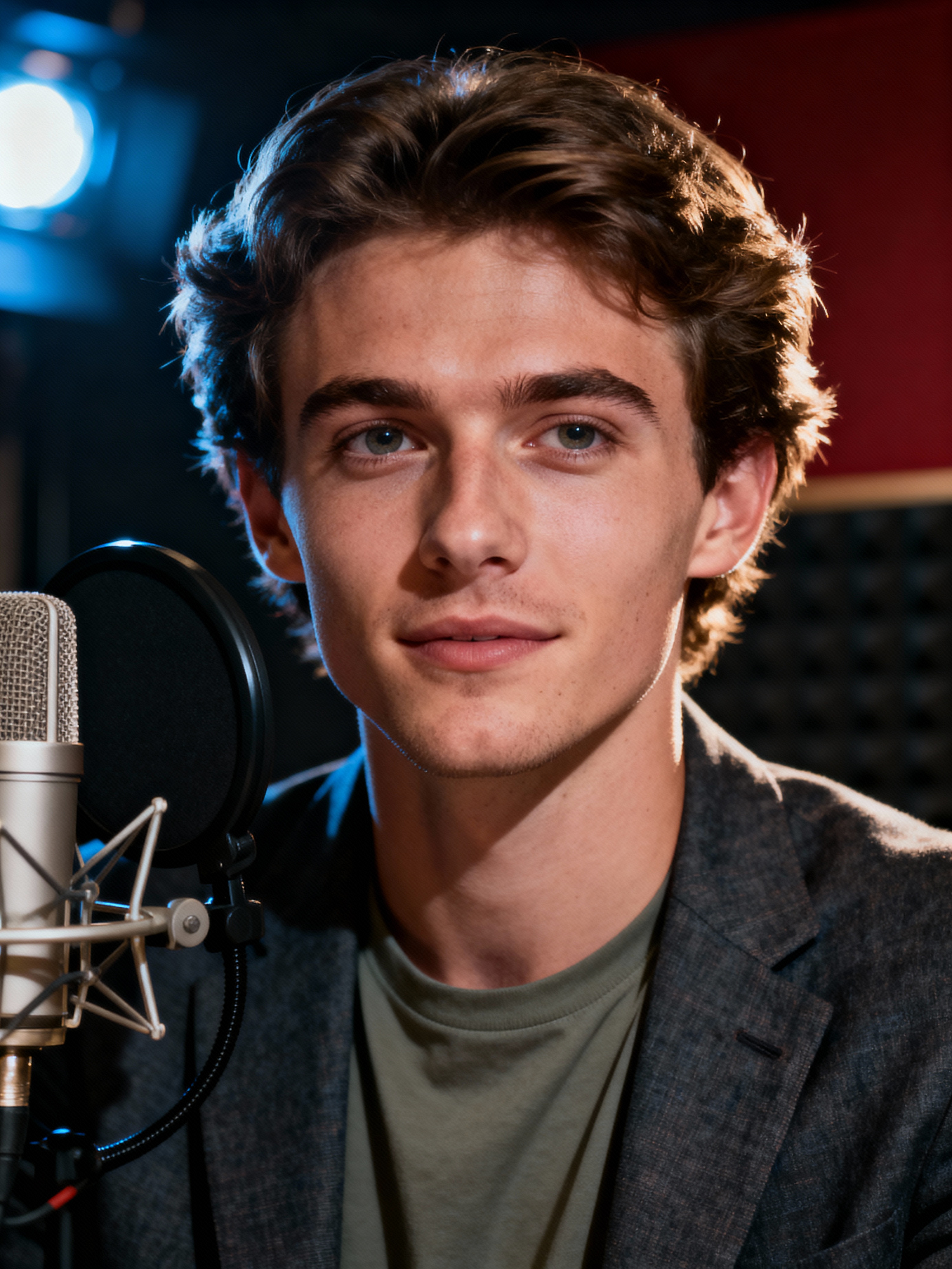 charismatic model dressed in casual blazer over quality t-shirt being interviewed, podcast studio setting, relaxed professional look