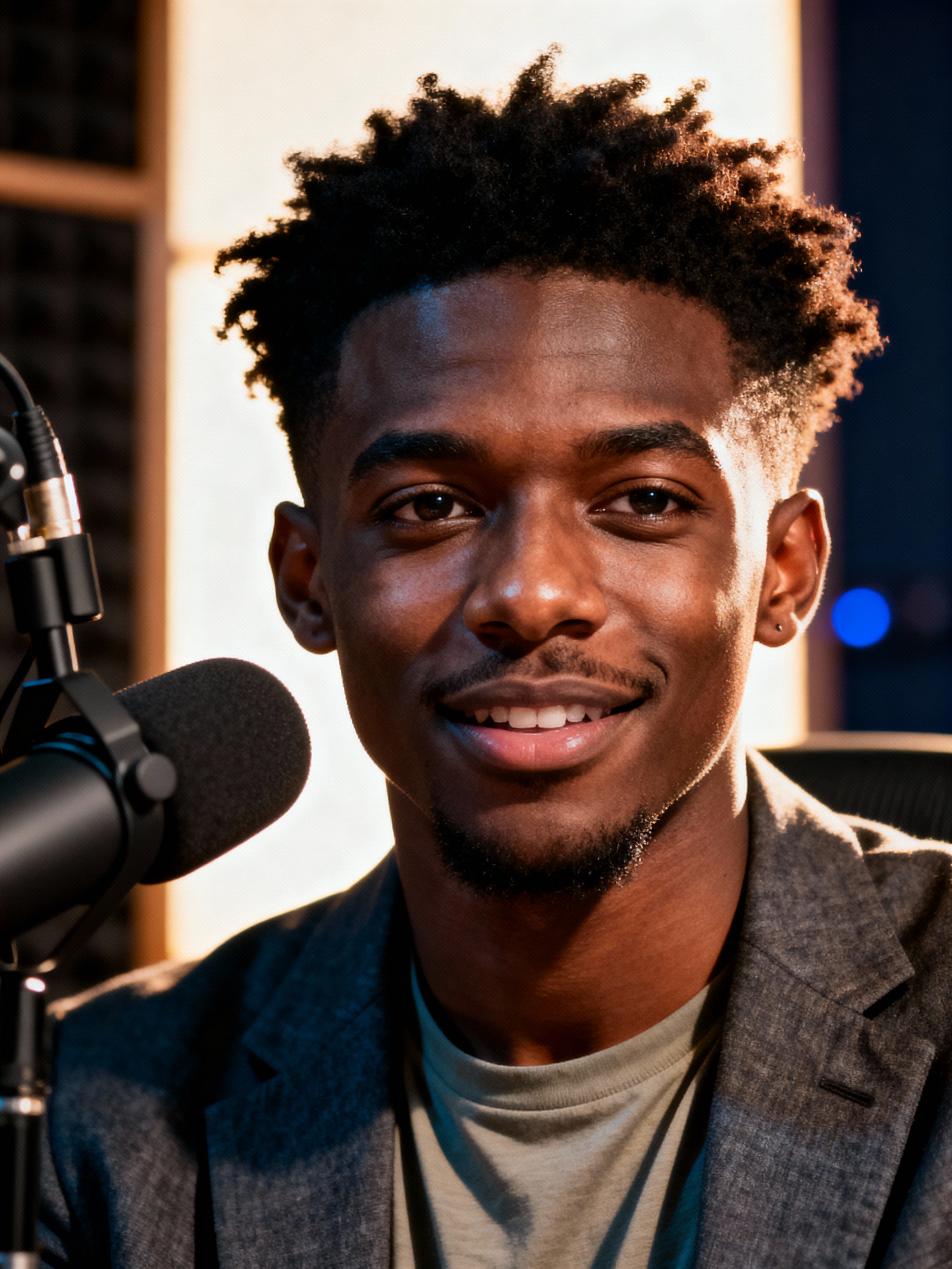 charismatic model dressed in casual blazer over quality t-shirt being interviewed, podcast studio setting, relaxed professional look