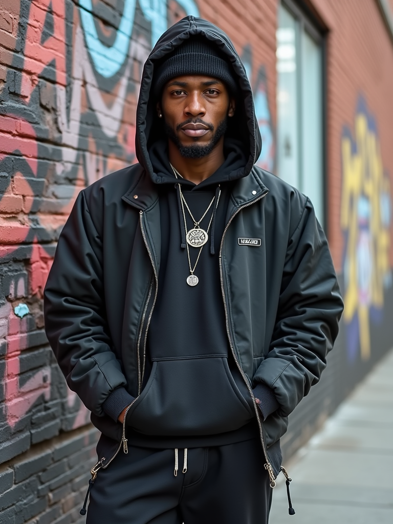 charismatic masculine model showing off an edgy streetwear look against an urban wall