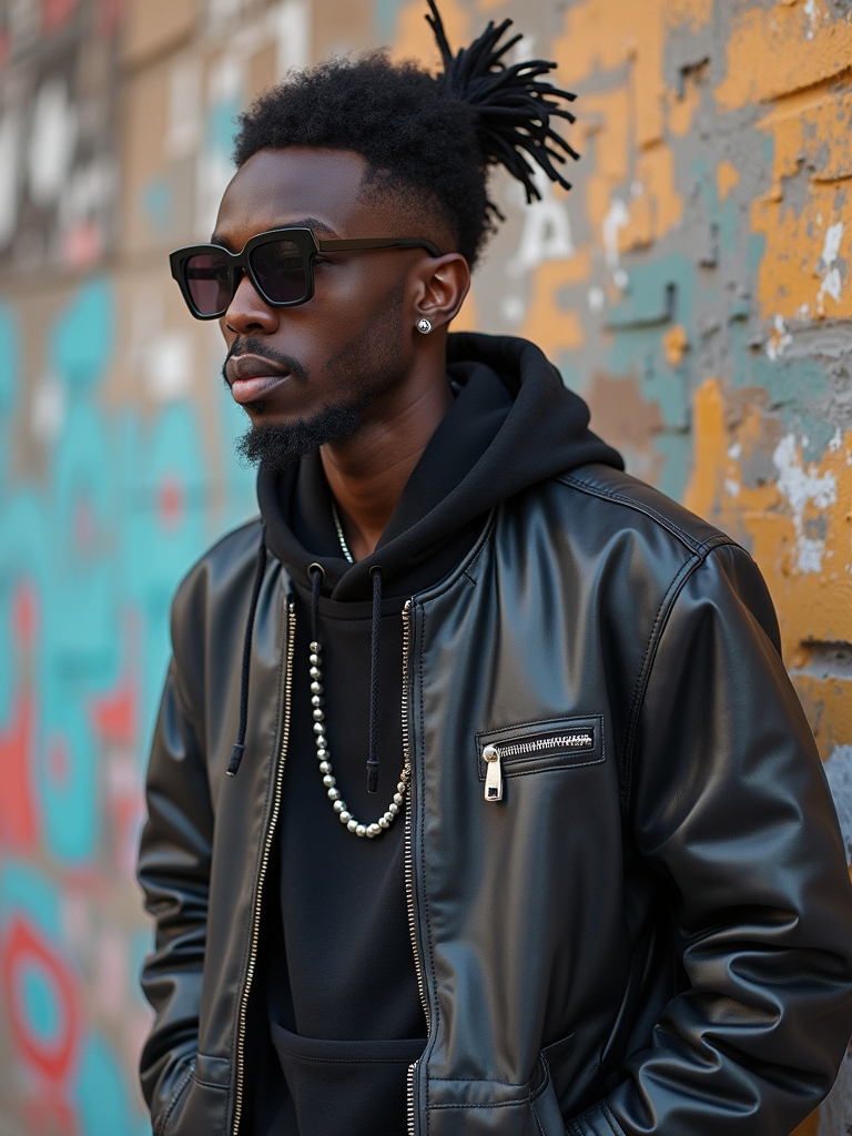 charismatic masculine model showing off an edgy streetwear look against an urban wall