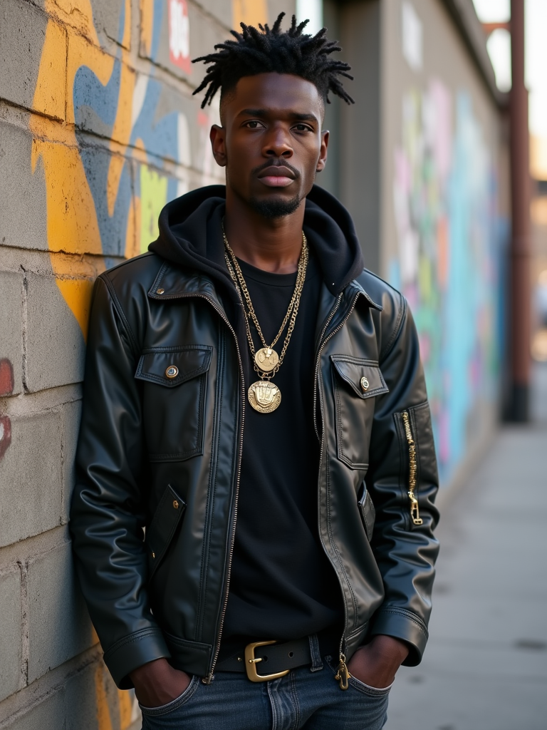 charismatic masculine model showing off an edgy streetwear look against an urban wall